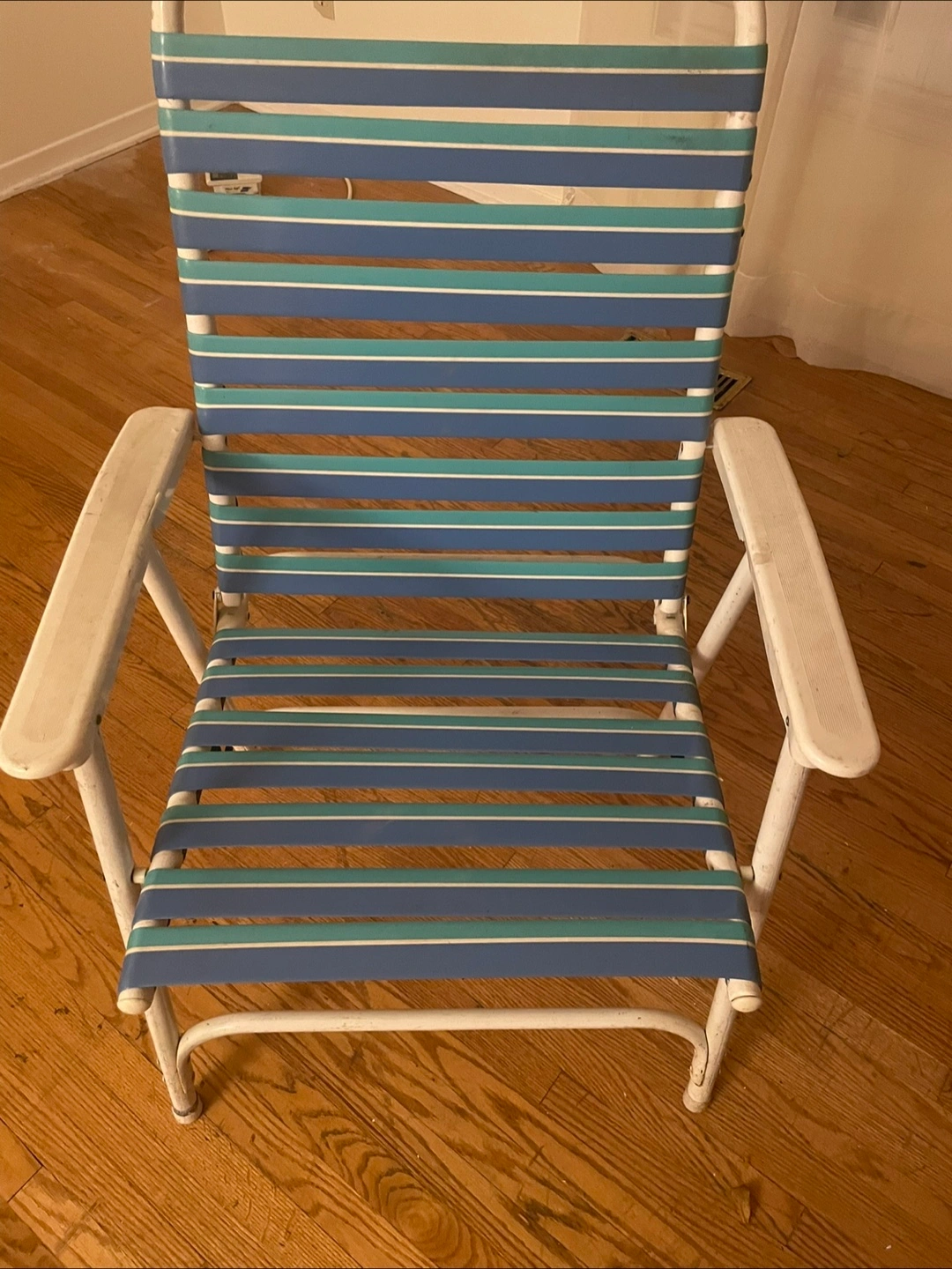 Selling a charming vintage webbed folding chair! It features a classic blue and white striped design. Perfect for the beach, patio, or just relaxing in the backyard. It's in good condition for its age and folds up easily for storage