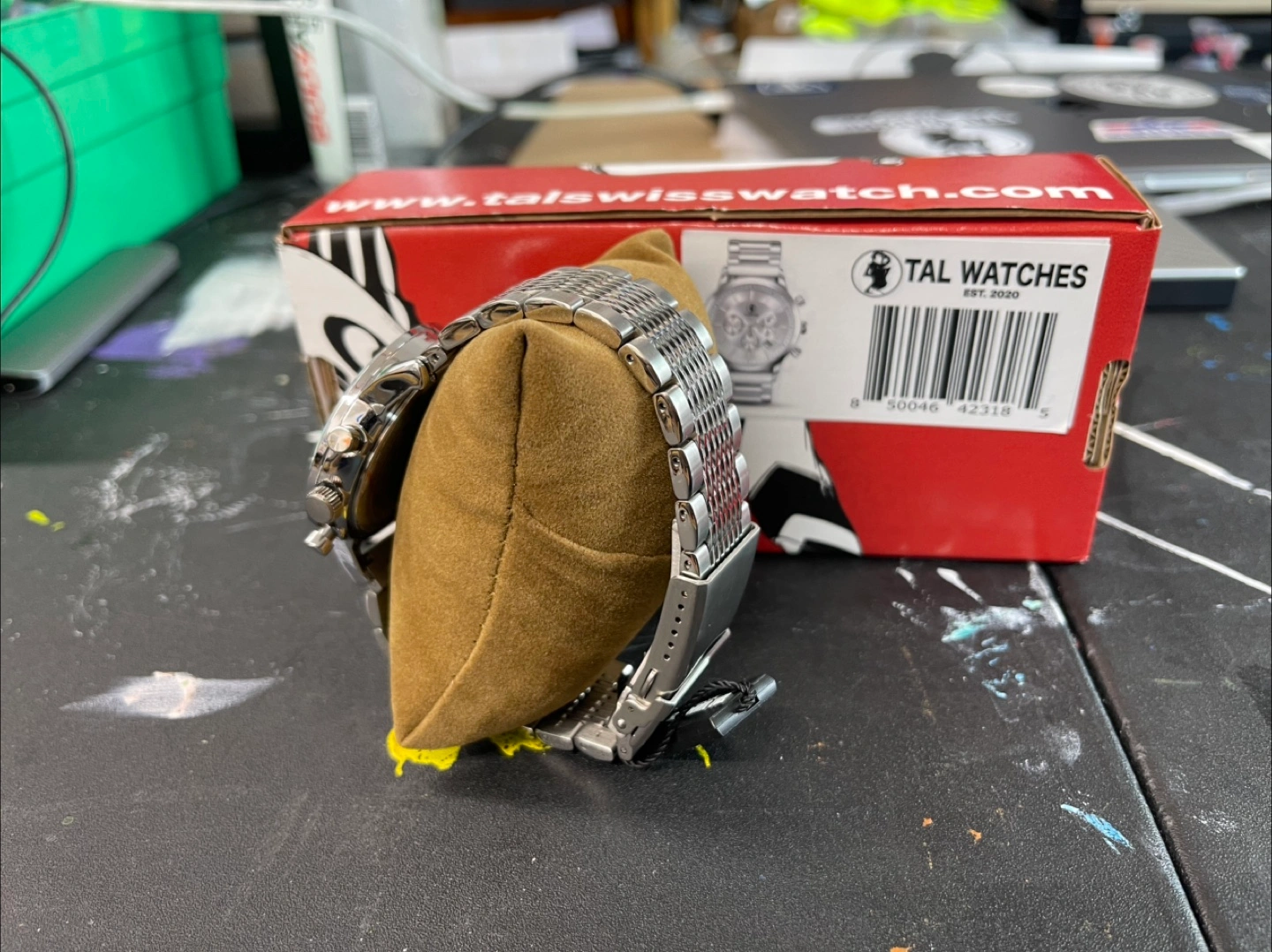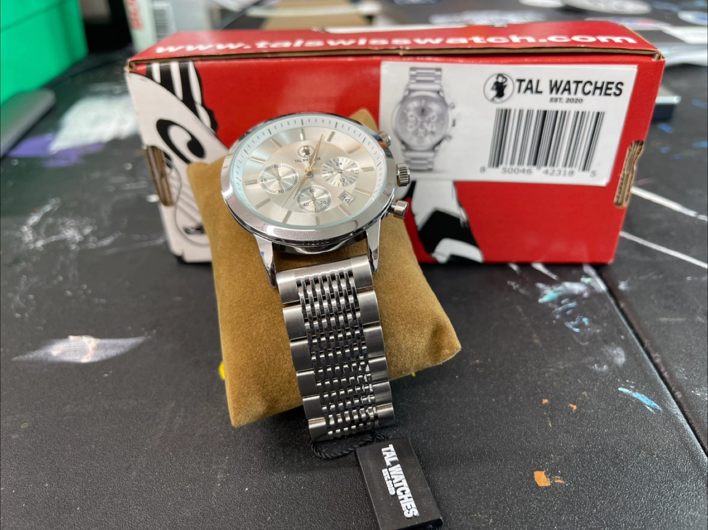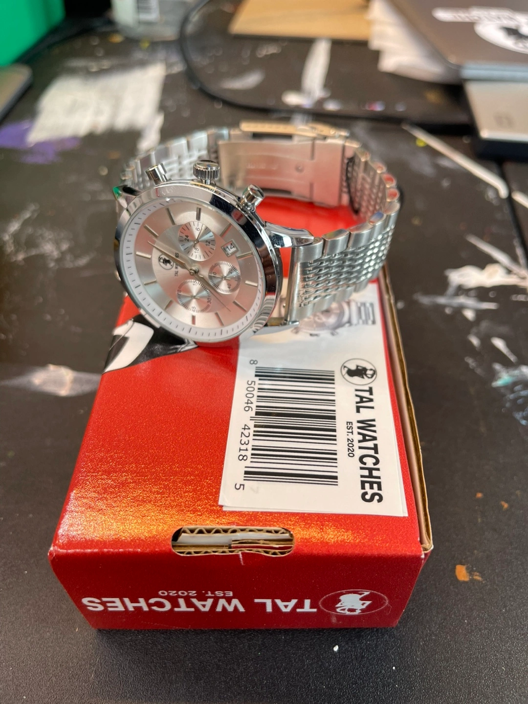 Selling a TAL Watches chronograph with a silver-tone finish. This watch comes with its original box, making it a great find for anyone looking for a stylish timepiece. It's in great condition and ready to wear!