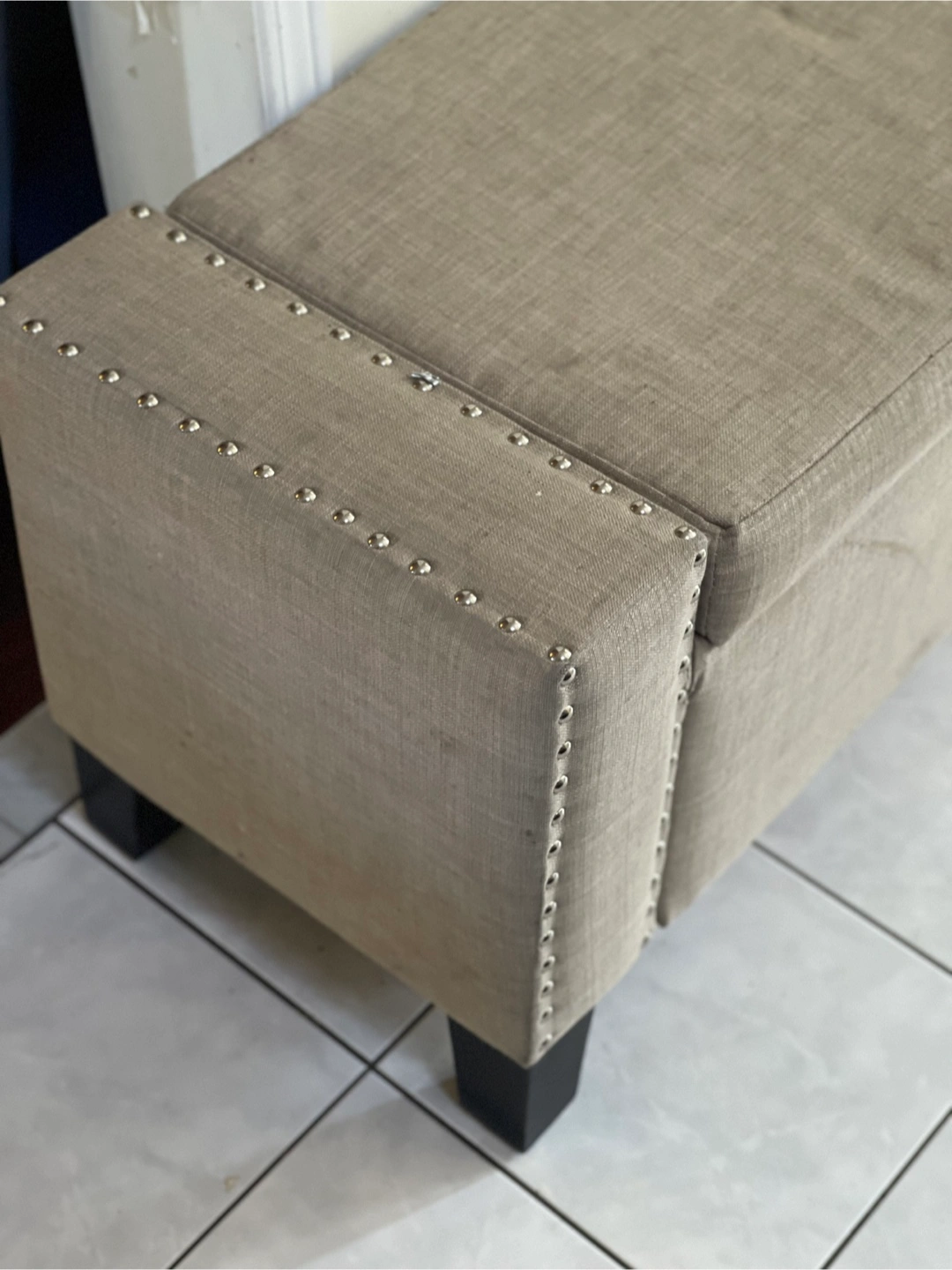 Selling a neutral-toned upholstered storage bench. It's in good condition and provides ample storage space inside. Perfect for decluttering and adding seating to any room