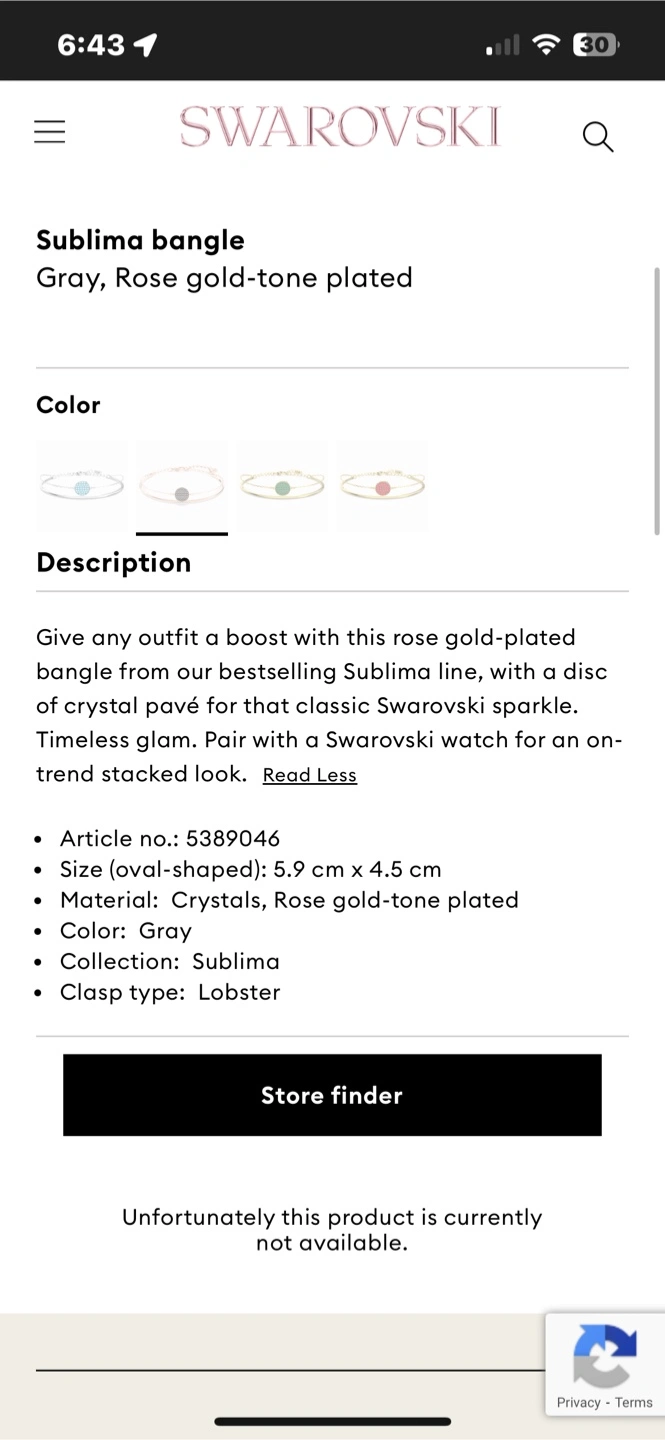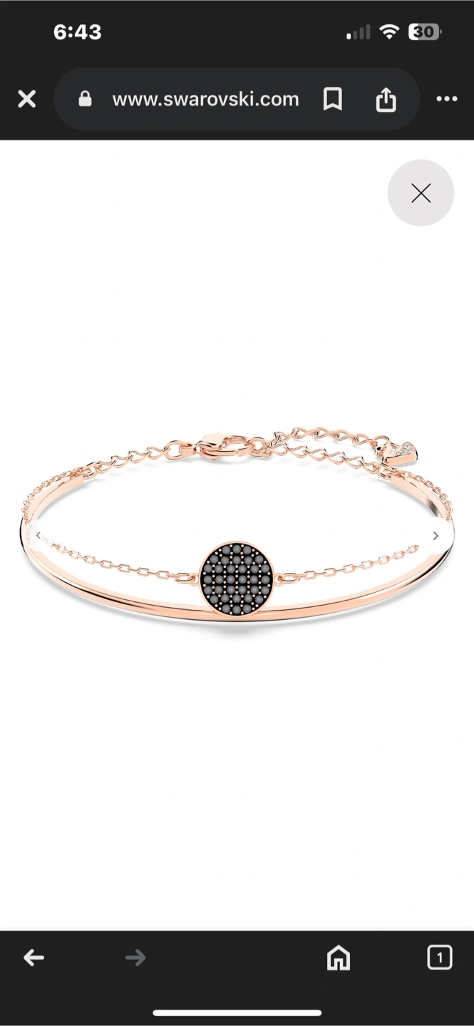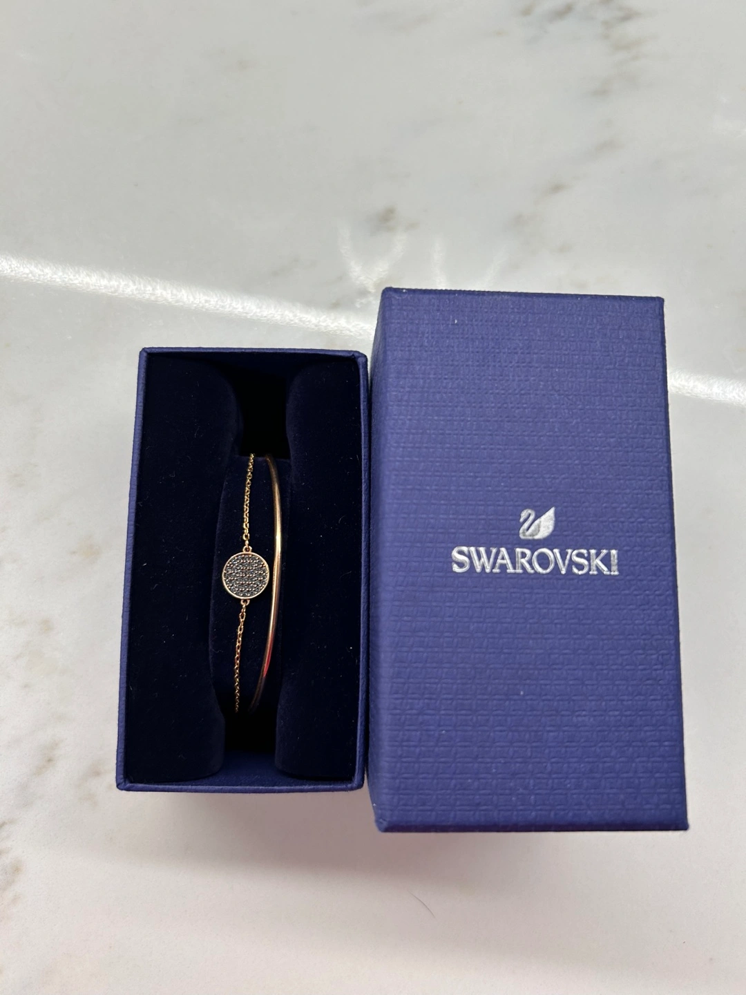 Selling a beautiful Swarovski Sublima Bangle Bracelet. It features a rose gold-tone plated band with a gray crystal pavé disc.