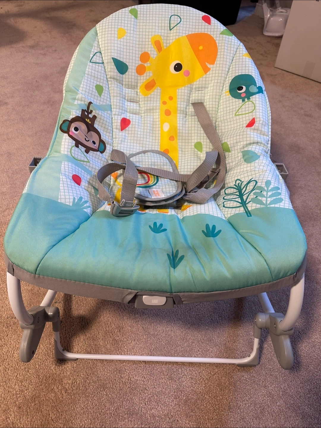 This Bright Starts Wild Vibes Infant to Toddler Rocker is perfect from newborn to toddler! It has a cute unisex design with monkeys and a giraffe. It also has vibrations to soothe your little one!