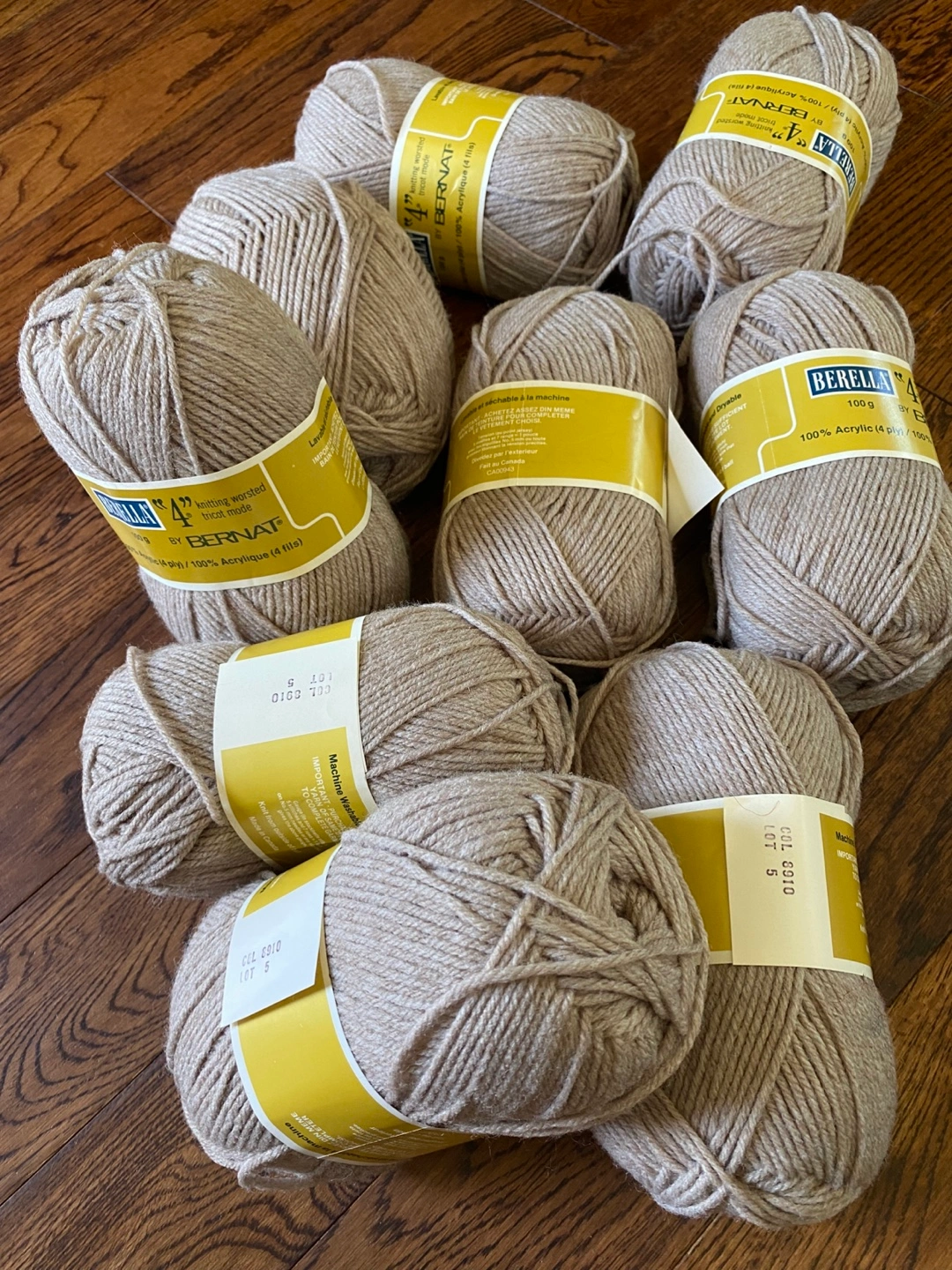 Soft beige colour ideal for a sweater or hat, scarf mitten set or even an Afghan throw. Easy care yarn. 9 balls all the same dye lot.