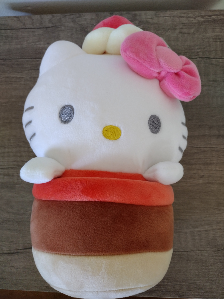 This adorable Hello Kitty plush is designed to look like a delicious dessert! It features Hello Kitty in a white and brown cylindrical shape, resembling a parfait or layered treat. The plush is soft and huggable, perfect for any Hello Kitty fan!