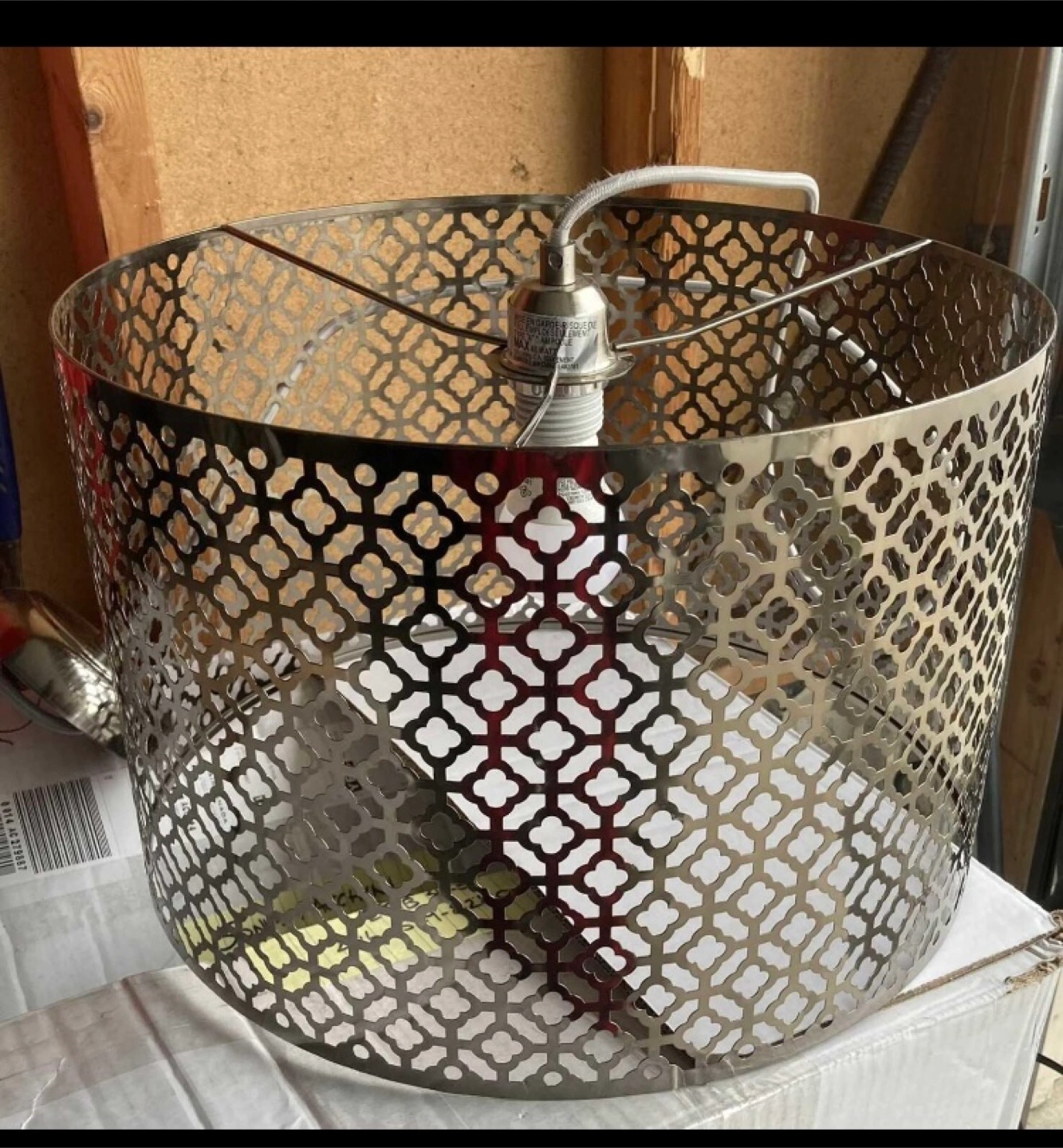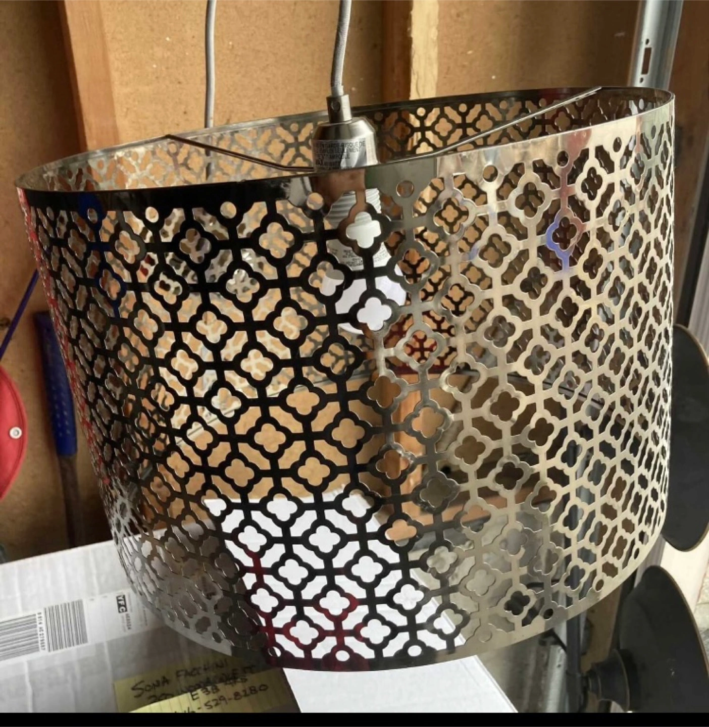 This is a stylish metal pendant lamp with a unique patterned design. It would make a great addition to any room!