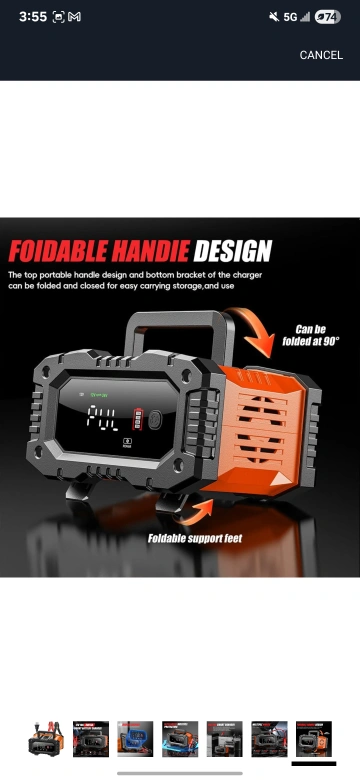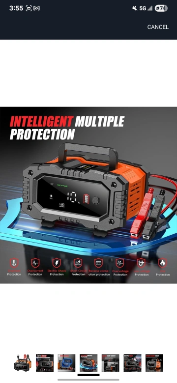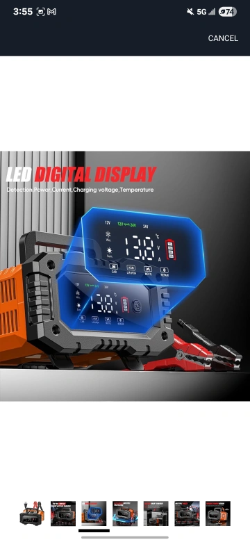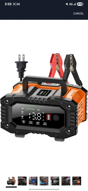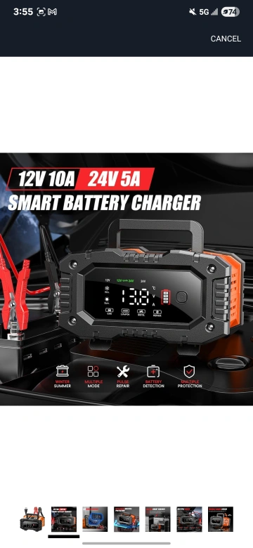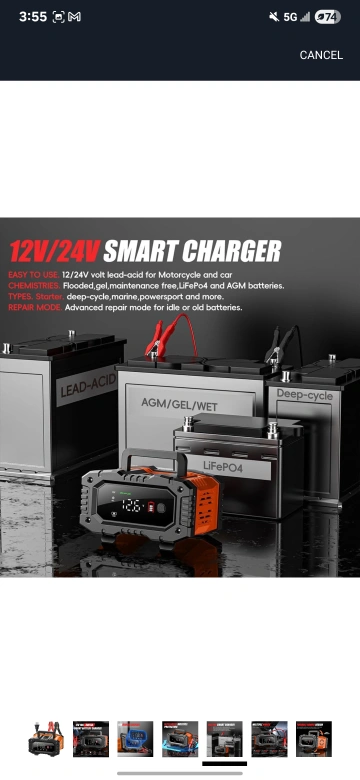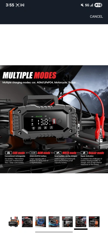 Selling a 12V/24V smart battery charger. It's designed for both motorcycle and car batteries, supporting various chemistries like flooded, gel, maintenance-free, LiFePO4, and AGM batteries. It also has an advanced repair mode for idle or old batteries, making it a versatile tool for battery maintenance