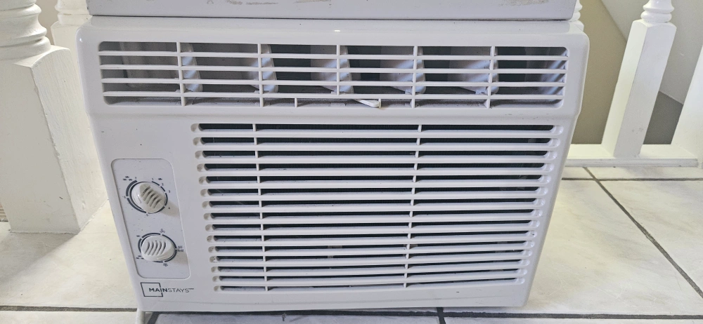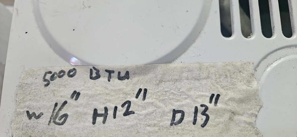 Selling a Mainstays room air conditioner. It's a 5000 BTU unit, perfect for cooling. The dimensions are approximately 16" wide, 12" high, and 13" deep. It uses R410A refrigerant and operates on a standard 115V/60Hz power source
