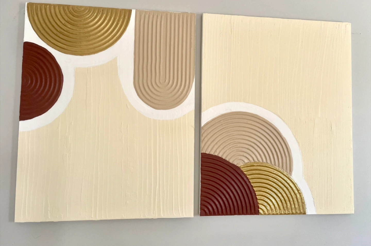 set of two Each size is 30x24” beautiful textured wall art pieces. They feature a modern, geometric design with neutral tones and a unique raised texture. Perfect for adding a touch of contemporary style to your home