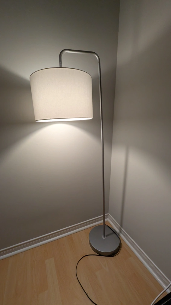 Selling a floor lamp with a silver finish. It has a simple, modern design that would look great in any living room or bedroom. The lamp provides a nice ambient light and is in good condition!