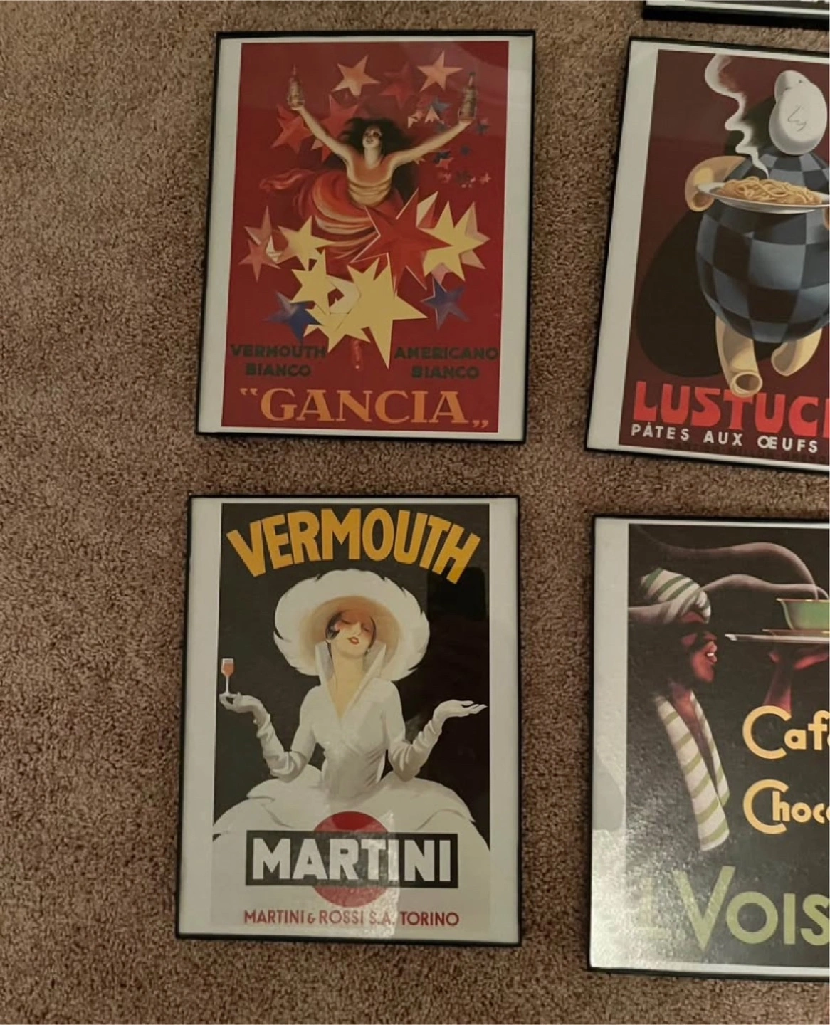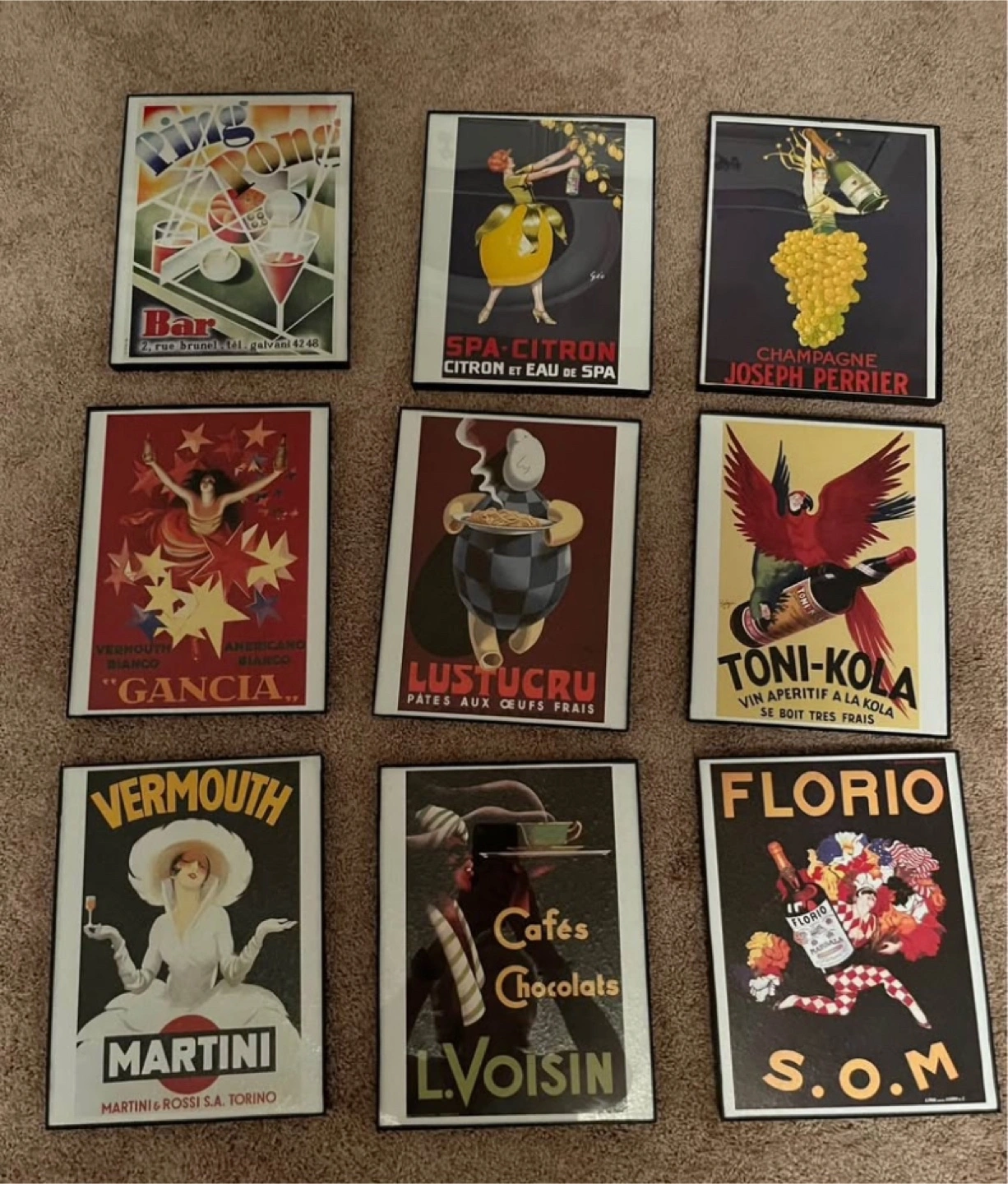 Frame in black frames with glass. All new.,Selling a set of nine vintage style advertising prints. Perfect for a feature wall. They feature classic designs for beverages and food. Perfect for adding a touch of retro charm to your home decor!