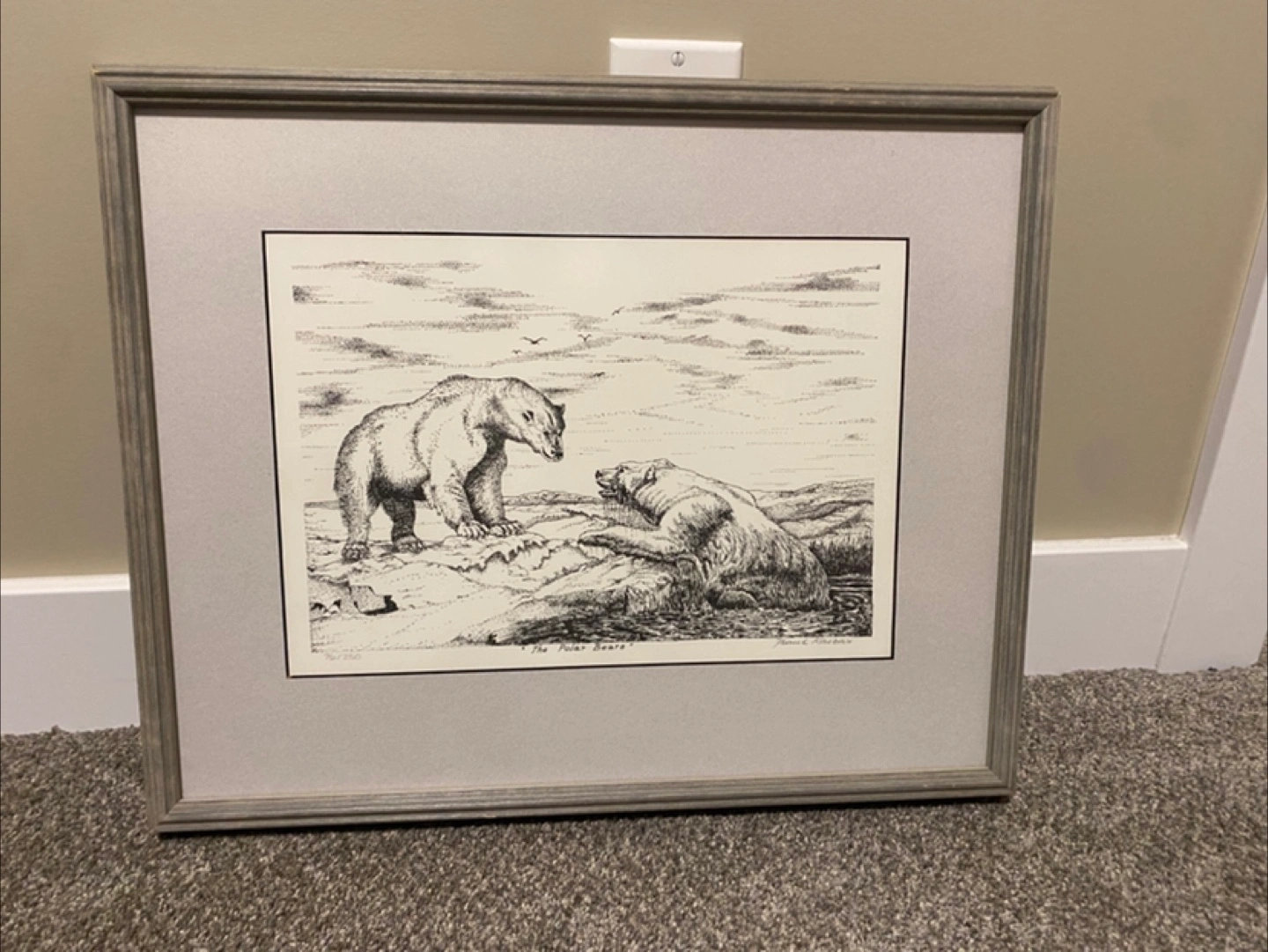 Artwork featuring two polar bears. Framed in a light grey wood. Measurements are in photos. Asking $5, cash only. Comes from pet- and smoke-free home. Available for pickup in Warman or Saskatoon.