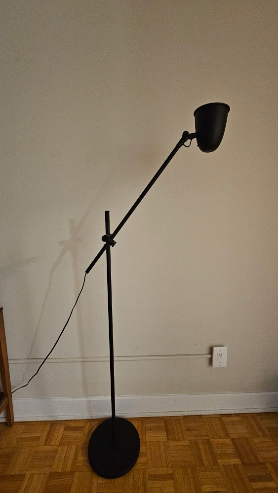 Selling a black adjustable floor lamp in great condition! The lamp is easy to adjust to different heights and angles, making it ideal for reading or working. Bulb included.