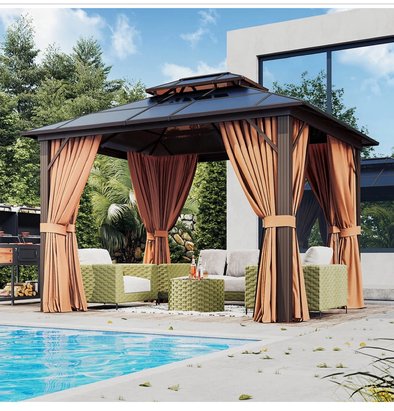 Jolydale 12'x10' Hardtop Gazebo features a durable polycarbonate double top and sturdy aluminum frame for a permanent pavilion. Complete with curtains and netting, it offers sunshade for lawns, patios, and gardens.