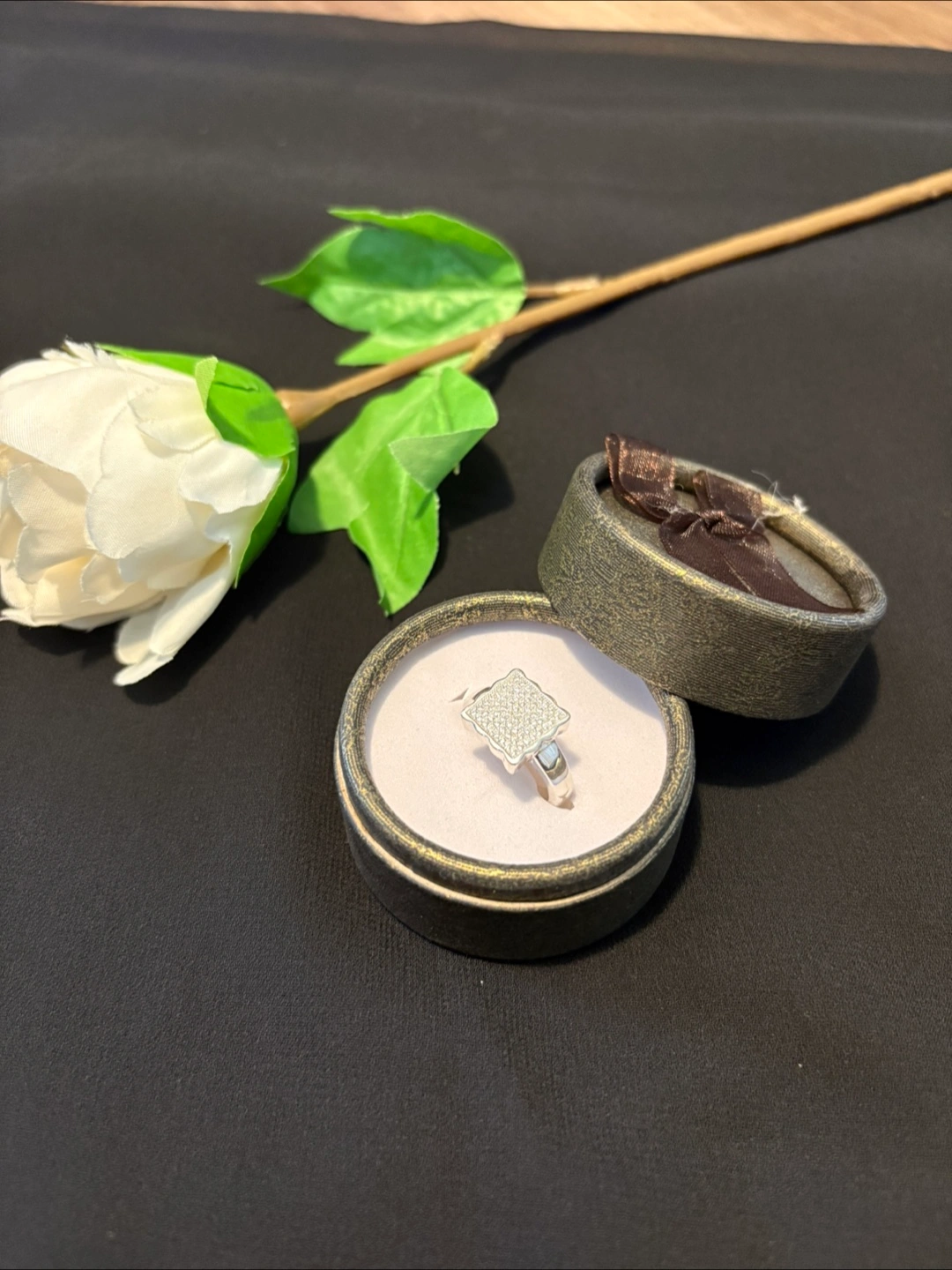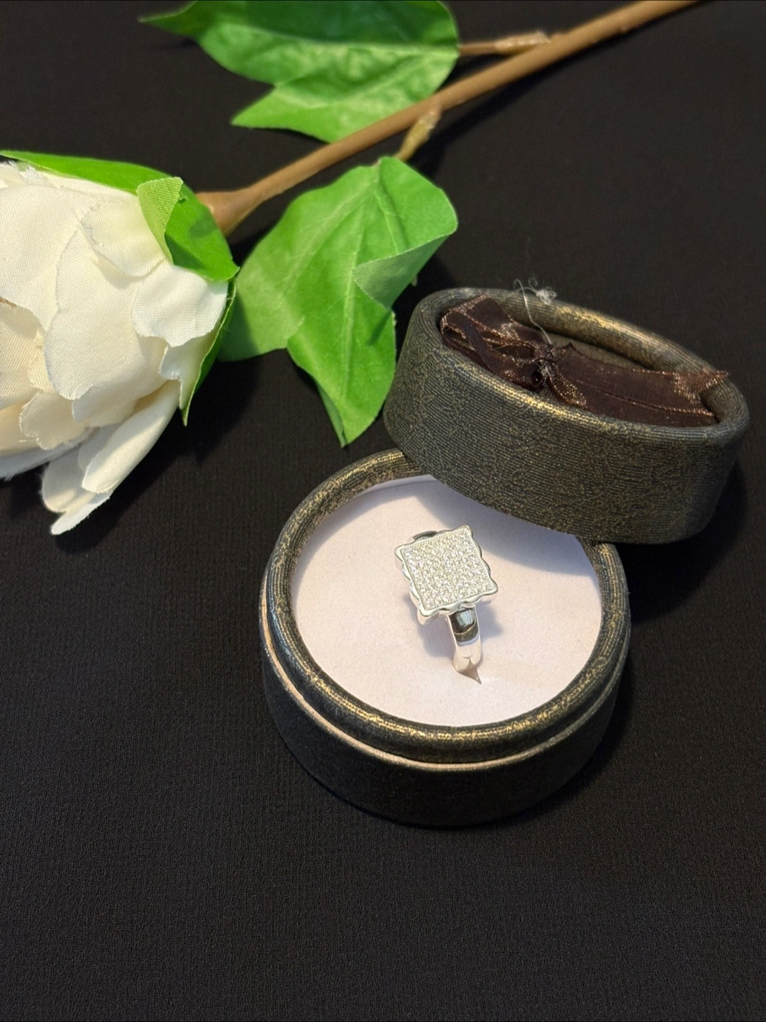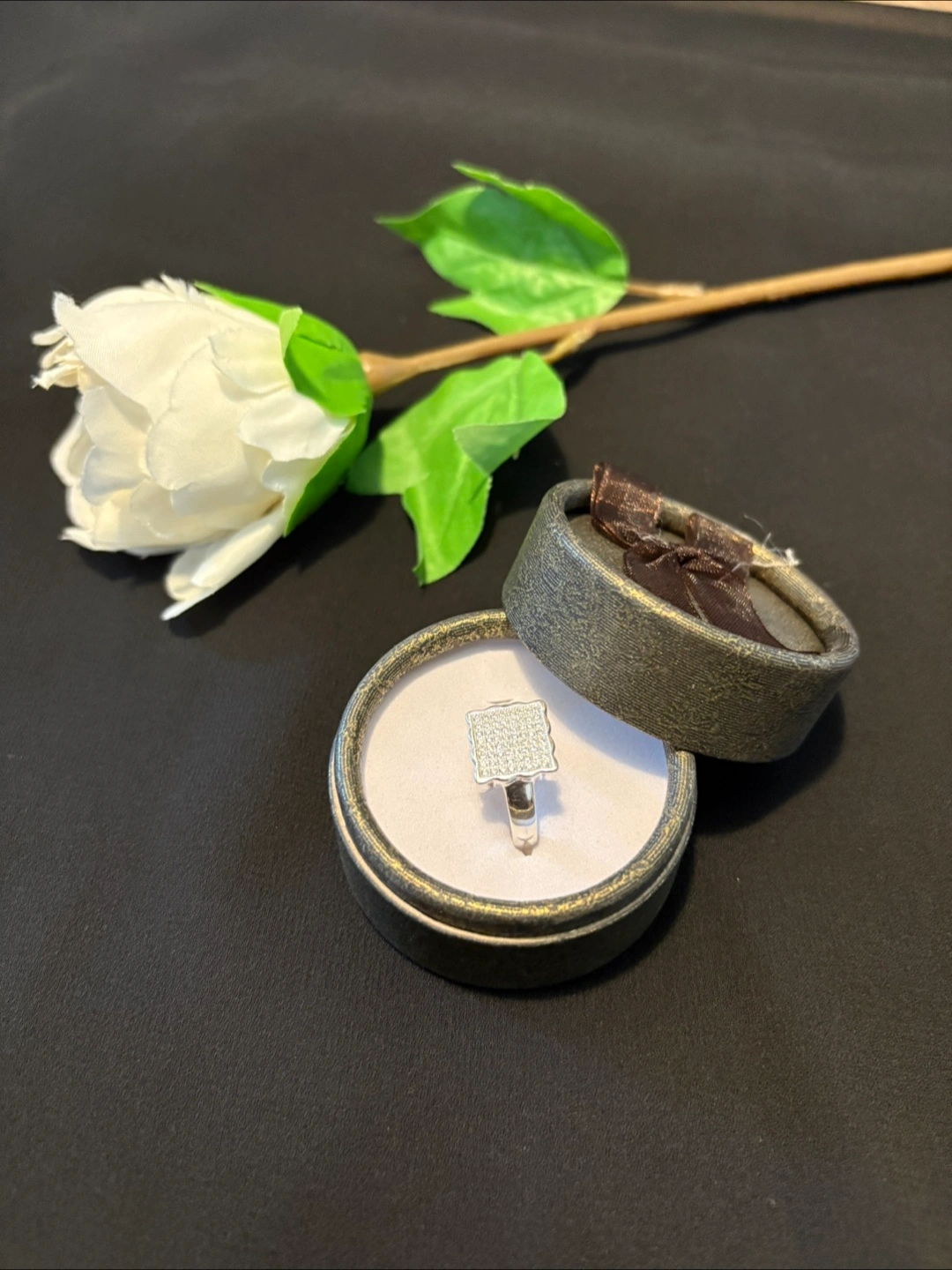 Selling a lovely silver ring featuring a unique square design. It comes with its original box, making it perfect as a gift or a treat for yourself! It's in great condition and ready for a new home