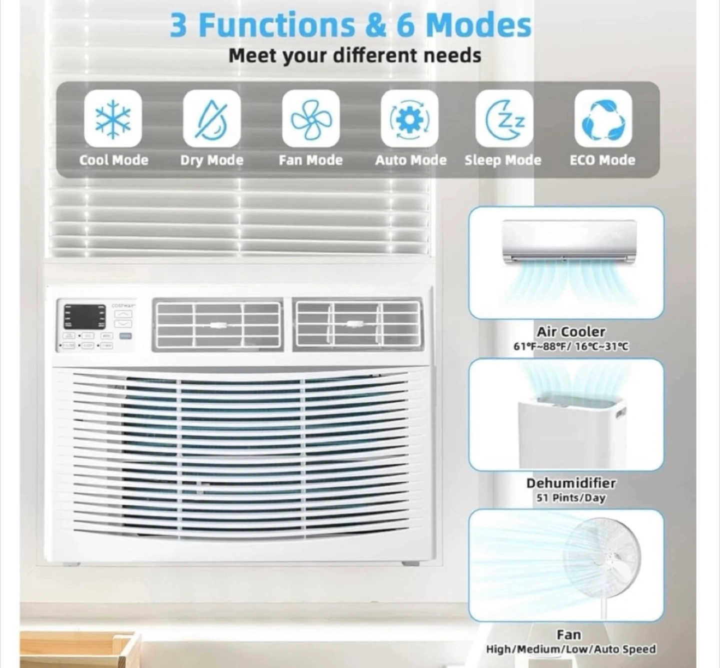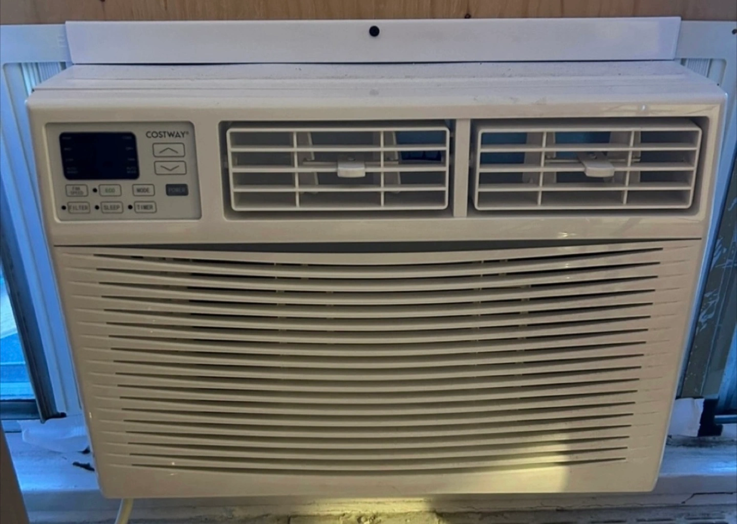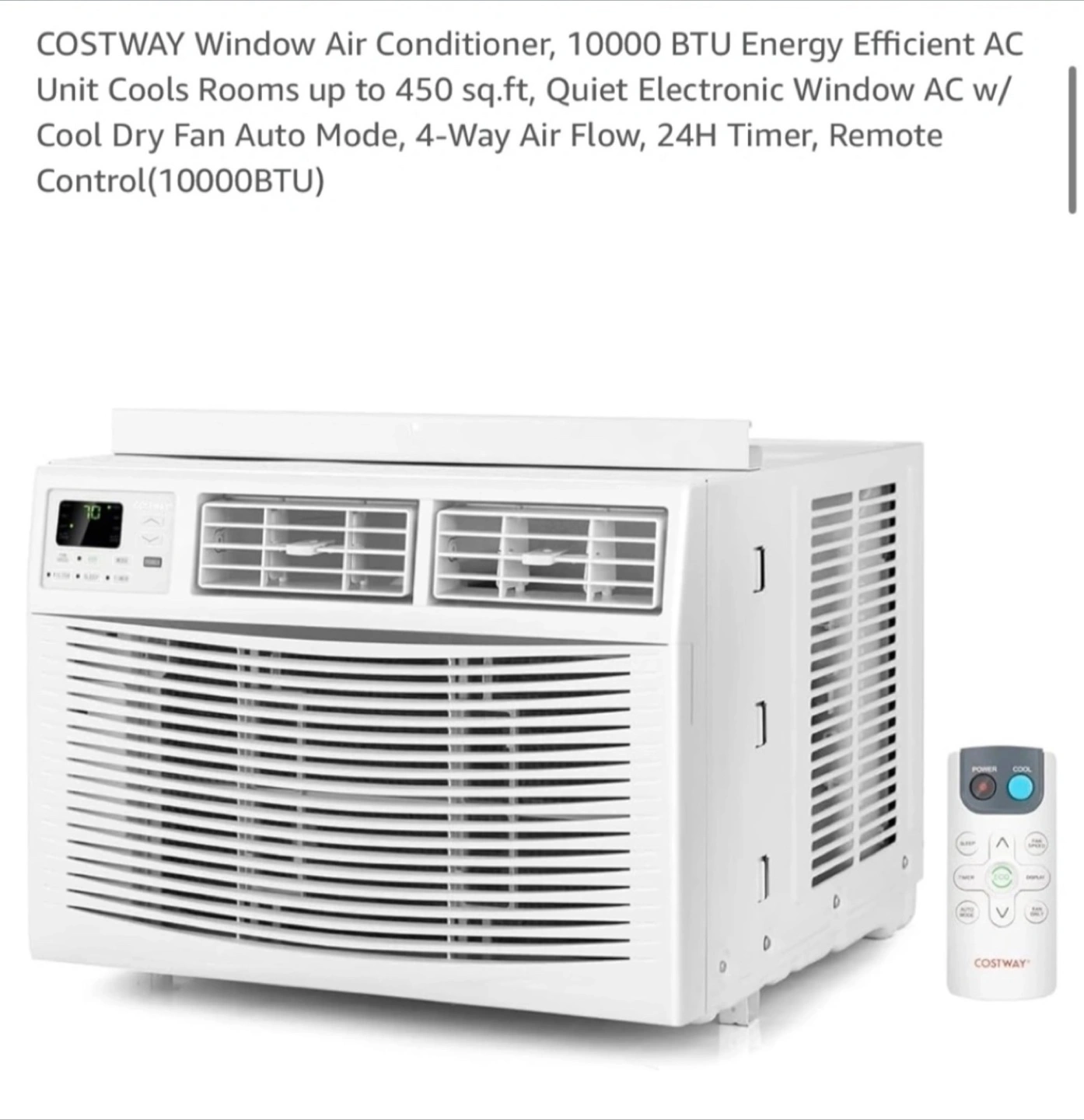 Selling a Costway window air conditioner. It's an energy-efficient 10000 BTU unit that cools rooms up to 450 sq ft. It features a quiet electronic window AC with cool dry fan auto mode, 4-way air flow, and a 24-hour timer. Comes with a remote control and black cover. Cash & pickup only!