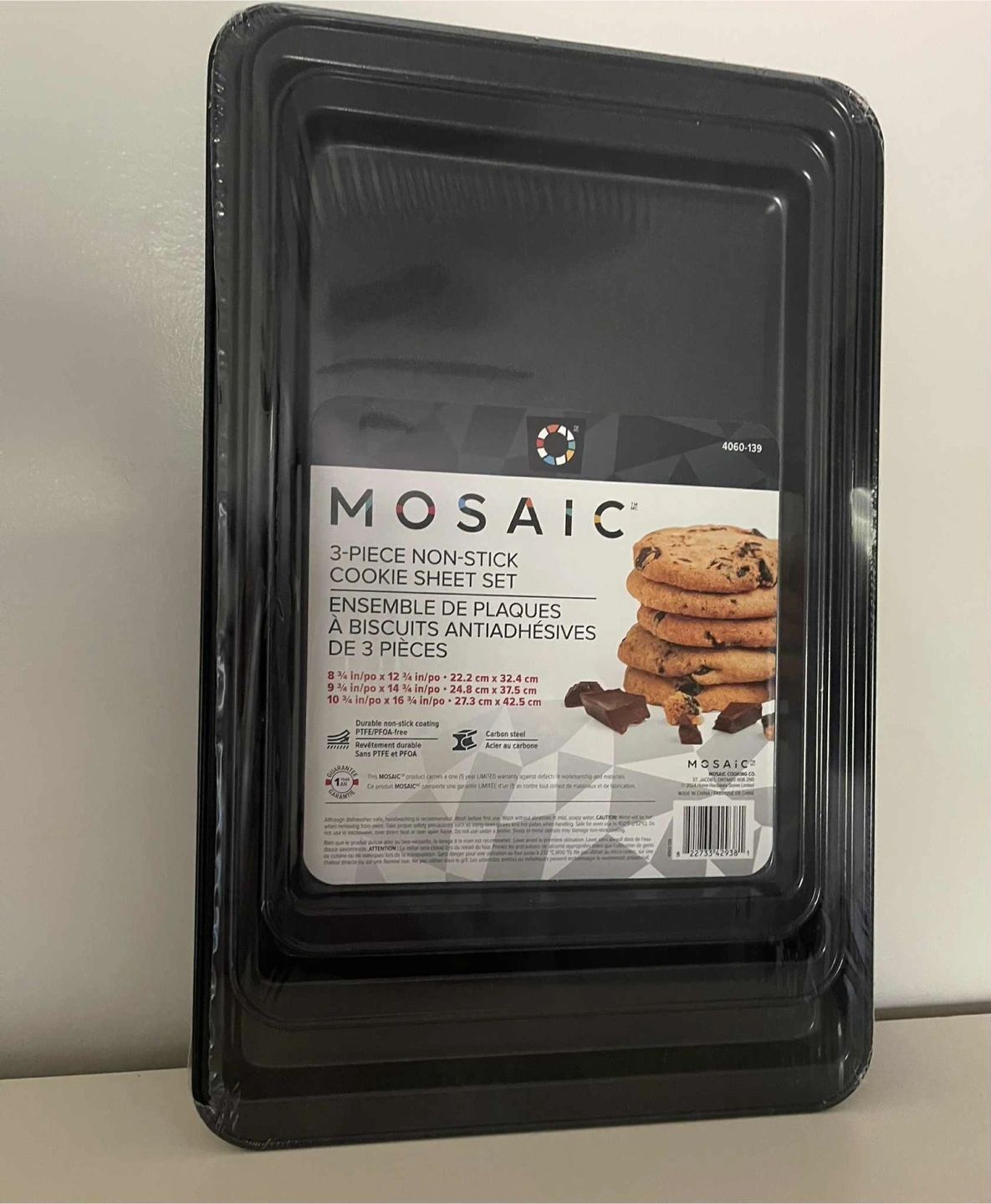 $40 I'm selling a brand new Mosaic 3-piece non-stick cookie sheet set! This set includes three different sizes: - 8 3/4 in x 12 3/4 in (22.2 cm x 32.4 cm) - 9 3/4 in x 14 3/4 in (24.8 cm x 37.5 cm) - 10 3/4 in x 16 3/4 in (27.3 cm x 42.5 cm) They feature a durable non-stick coating that is PTFE/PFOA-free and are made of carbon steel. Perfect for baking up some delicious treats!
