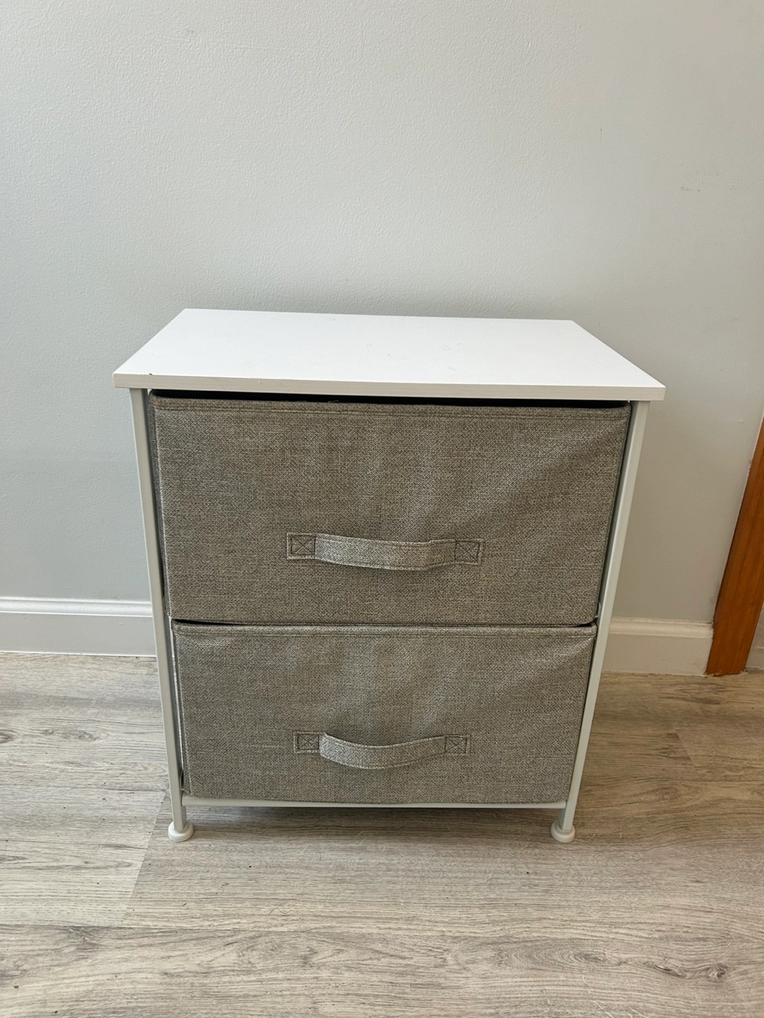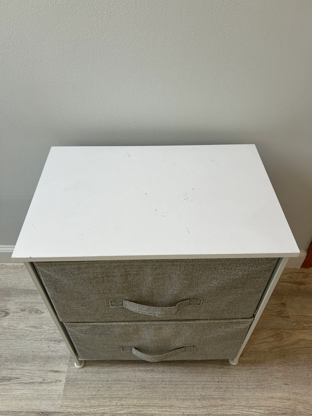 This is a 2-drawer storage dresser with gray fabric drawers and a white top. It's perfect for adding some extra storage to any room. The dresser is in good condition and ready for a new home