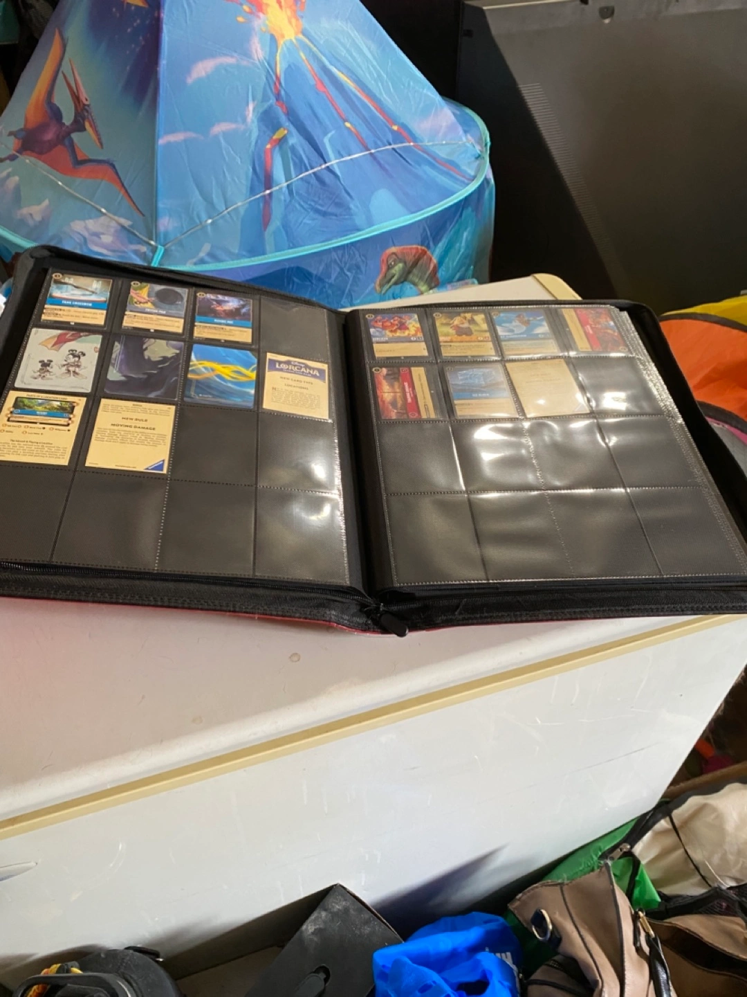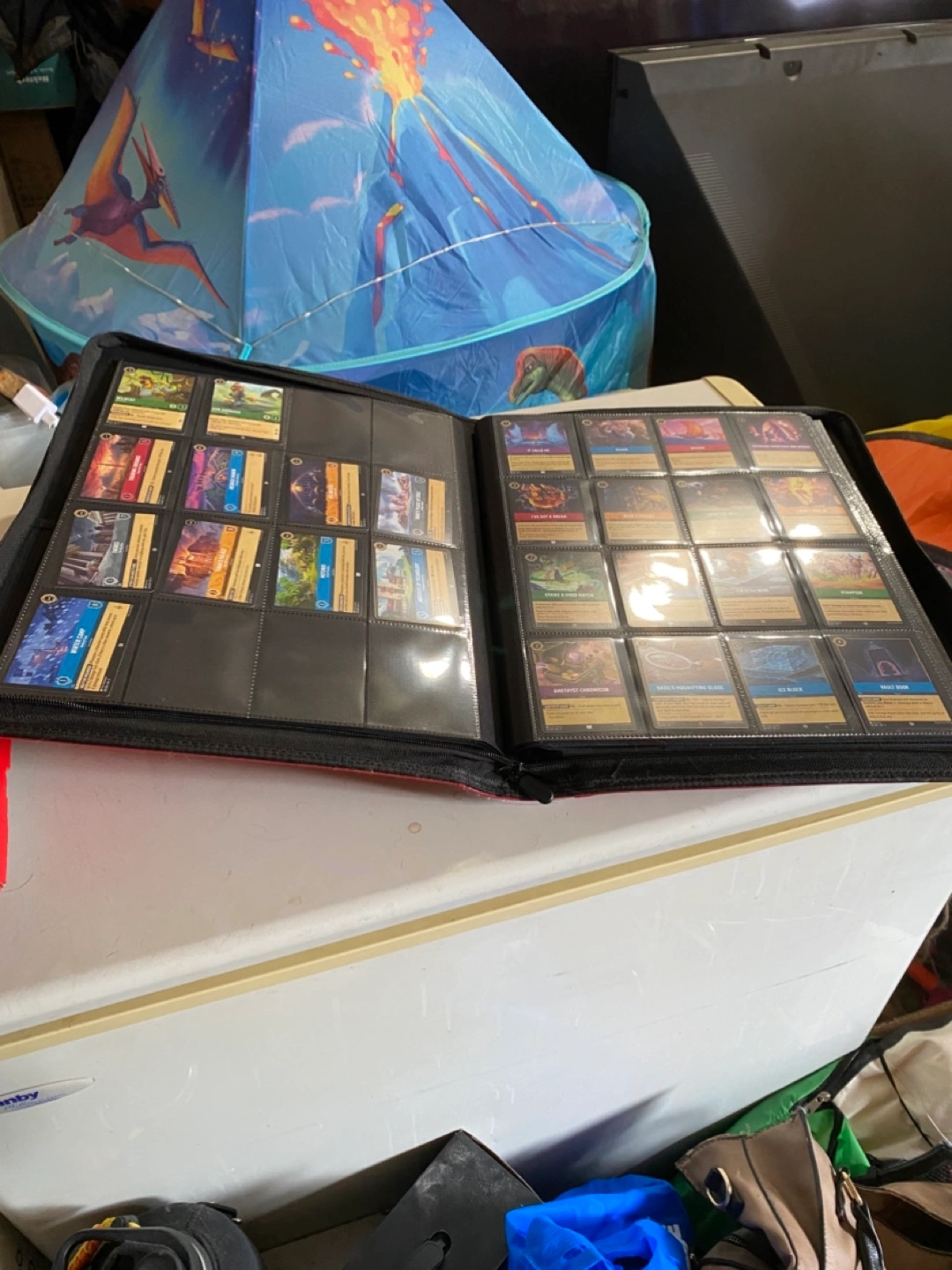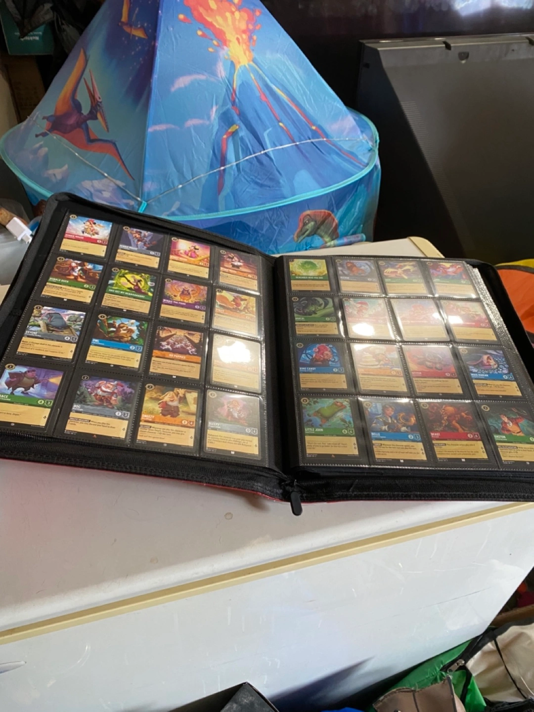 154 brand new out of package Disney Lorcana cards with a Lorcana binder and game mat. The first 8 cards are shiny and the last 5 cards are doubles.