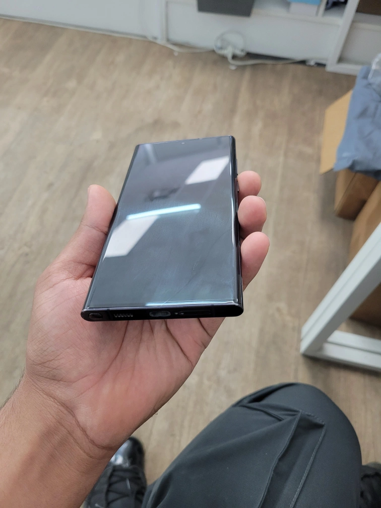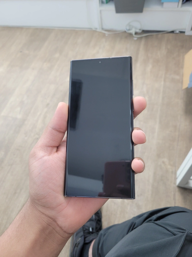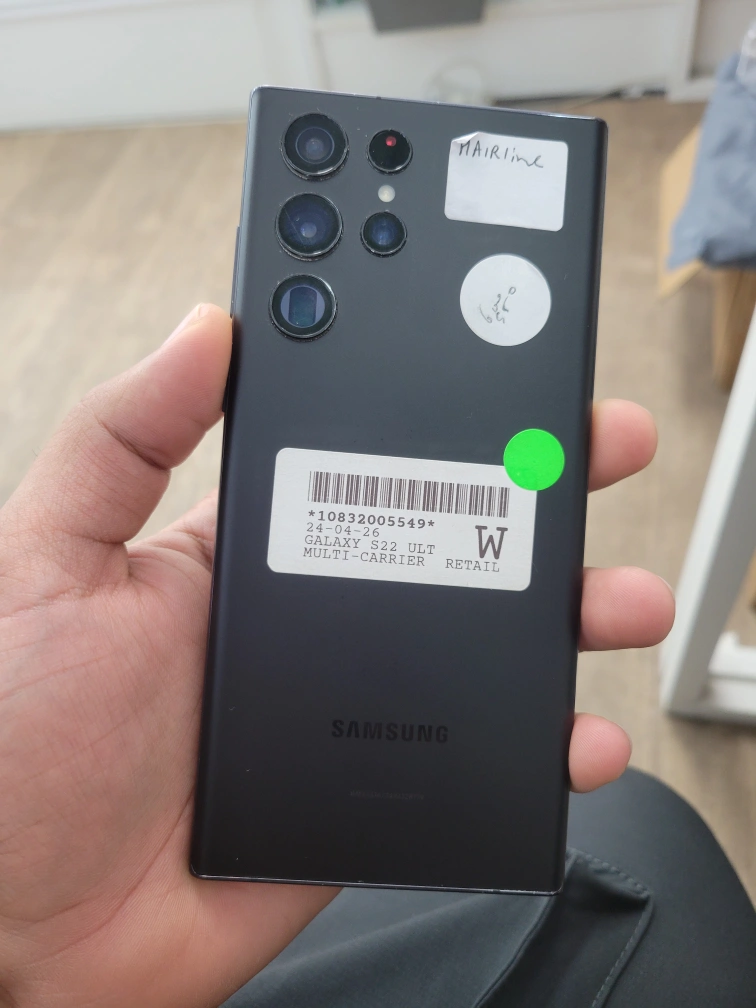 81Selling a Samsung Galaxy S22 Ultra in black. It's in great condition and ready for a new owner! has a minor hairline can be seen in photo