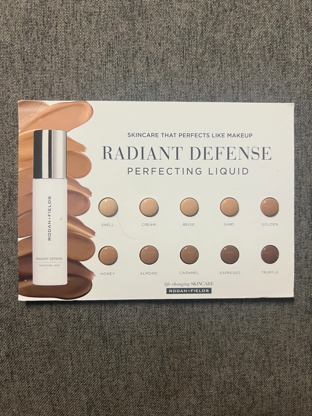 Brand new sample of Rodan + Fields Radiant Defense Perfecting Liquid. It's skincare that perfects like makeup! Available in a variety of shades: Shell, Cream, Beige, Sand, Golden, Honey, Almond, Caramel, Espresso, and Truffle