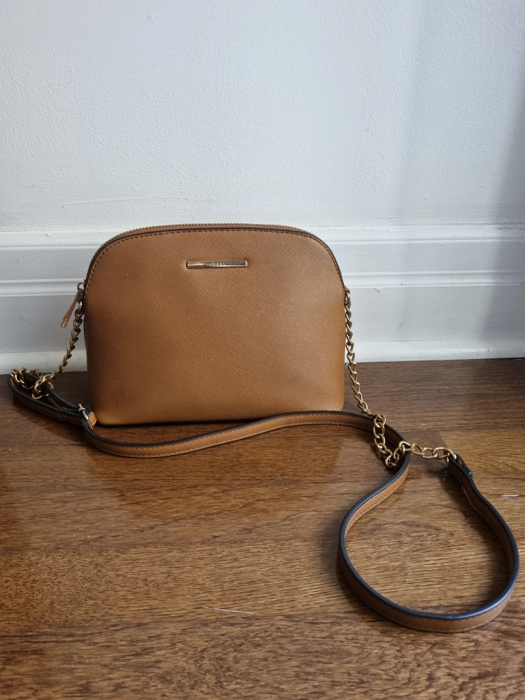 Selling a cute Aldo dome crossbody bag in brown. It's has a gold chain detail. The zip is slightly discolored (image attached) but otherwise it is in good condition!