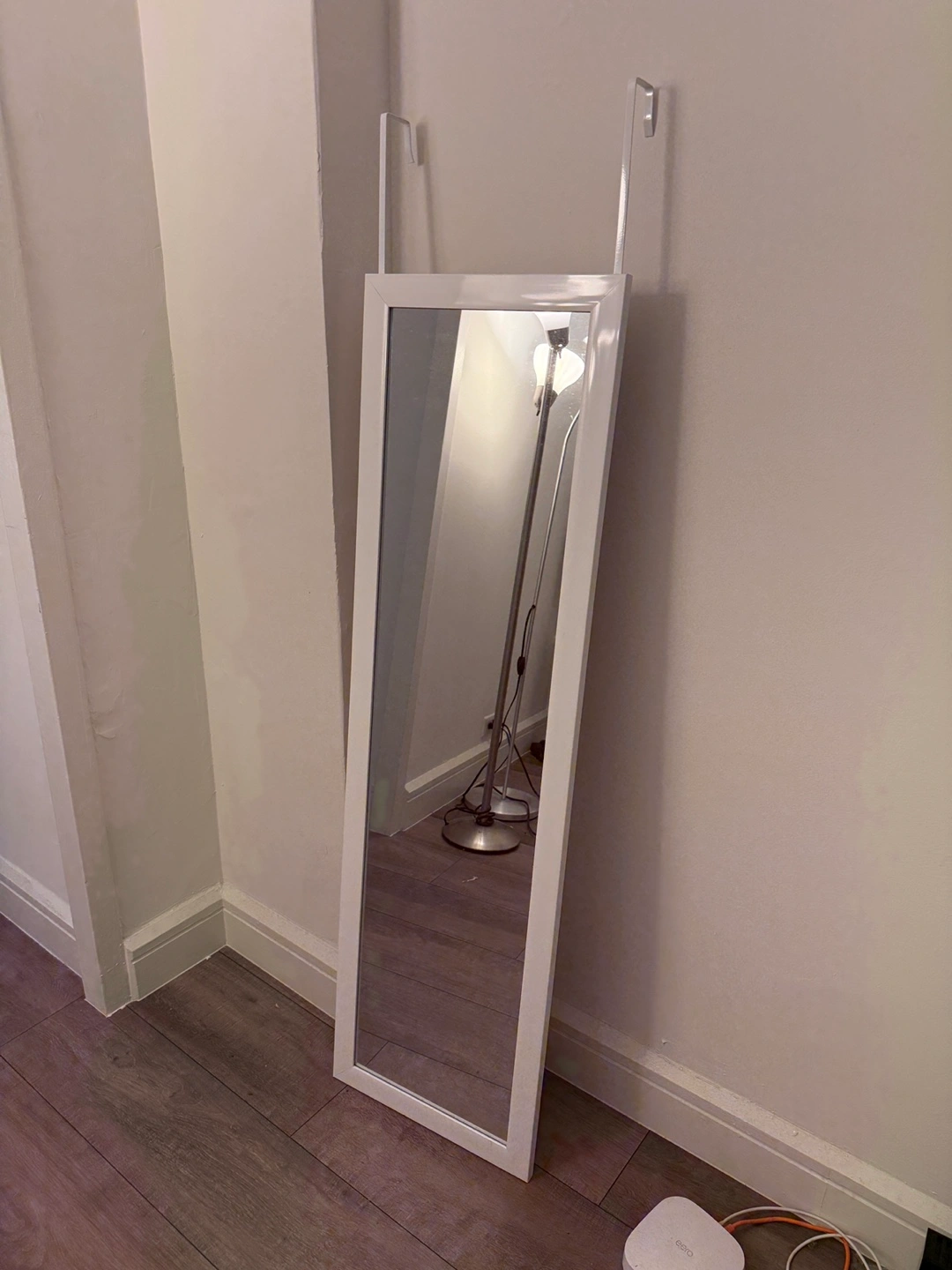 Selling a full-length mirror designed to hang over a door. It has a white frame and is in great condition. Perfect for adding a mirror to a room without taking up wall space