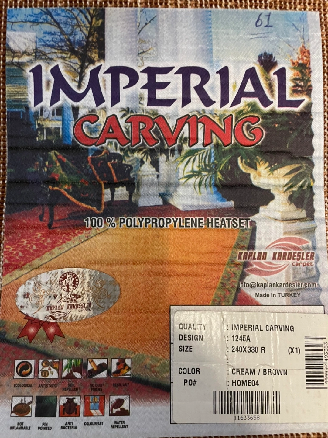 It features the Imperial Carving design. The size is 240x330 R (cm). It's made in Turkey and crafted from 100% polypropylene heatset