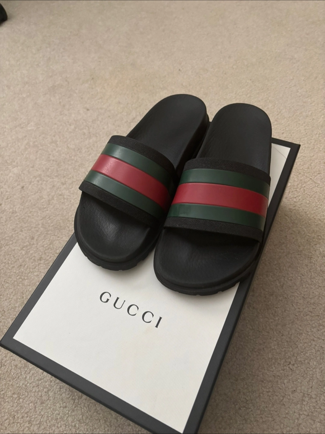 Selling a pair of Gucci slides in great condition! They come with the original box. The iconic green and red stripe adds a touch of luxury to these comfortable slides. Size 8.