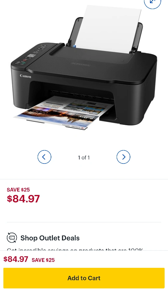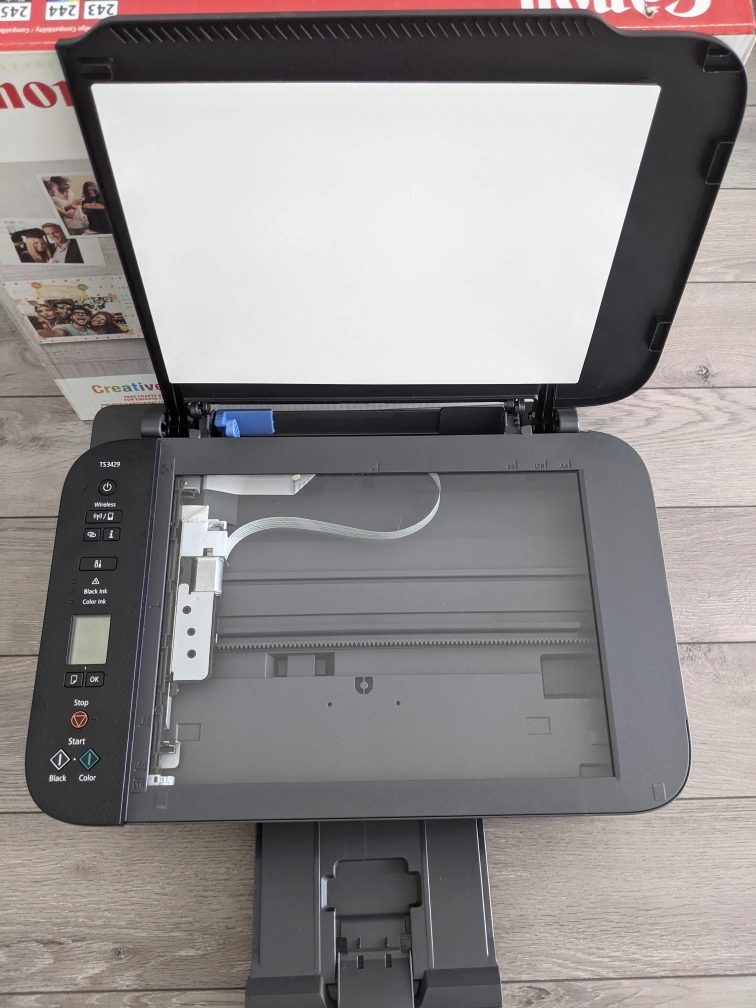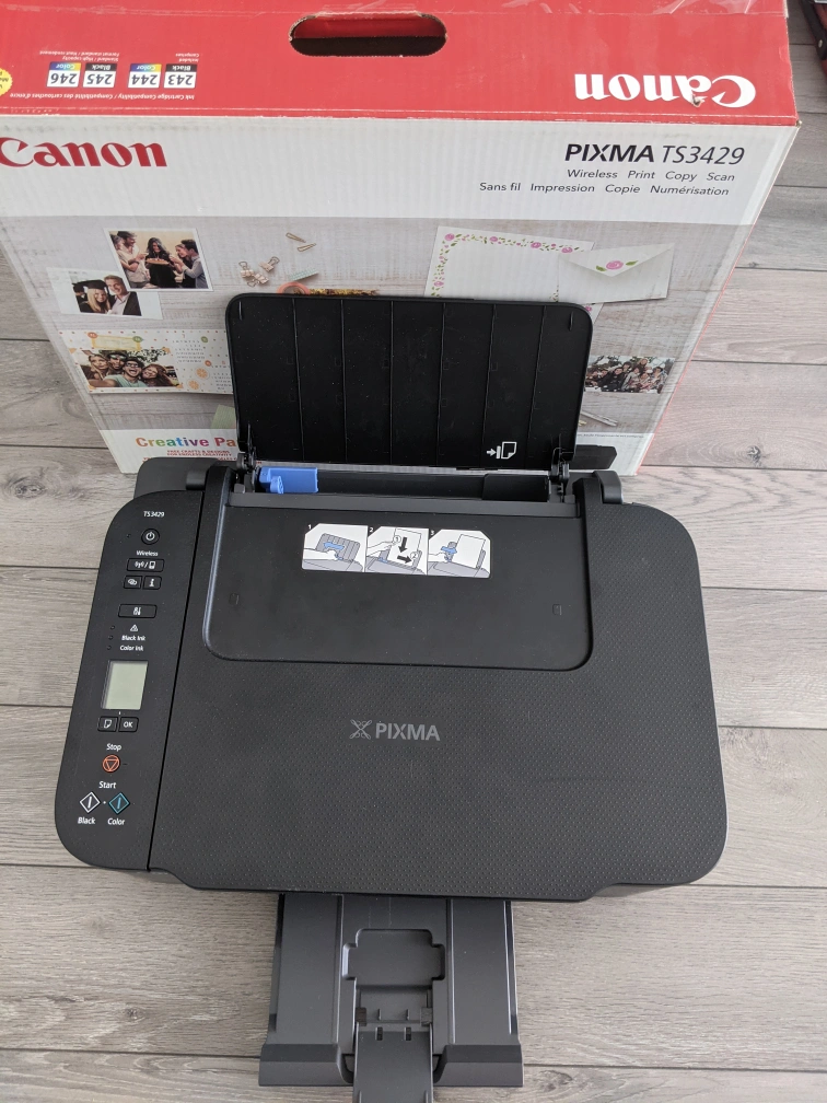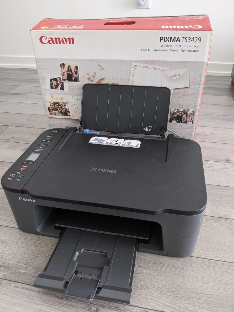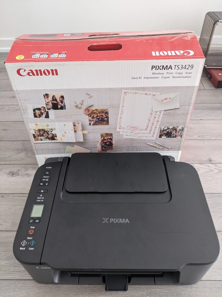 I'm selling a Canon PIXMA TS3429 all-in-one inkjet printer, perfect for home use with its wireless printing capabilities. It can print, scan, and copy, making it a versatile addition to any home office. This printer has served me well and is still in good working condition.