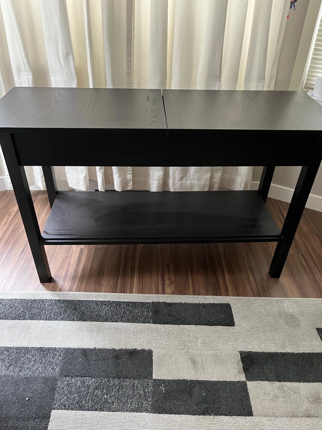 Selling a simple black console table. It features a clean design with a shelf underneath for extra storage or display. Perfect for an entryway or living room!