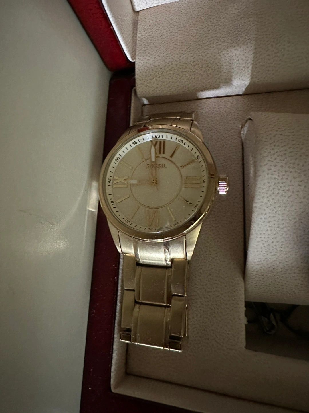 Selling a beautiful Fossil watch in gold tone! It's in great condition and comes with its original box and cushion pillow. A classic and elegant timepiece to add to your collection