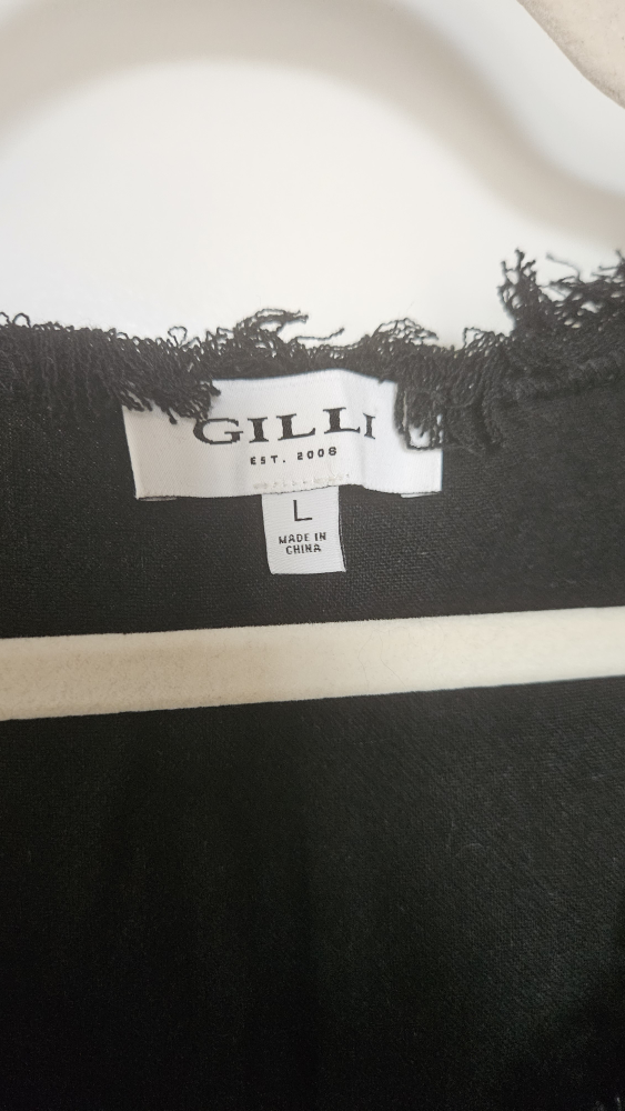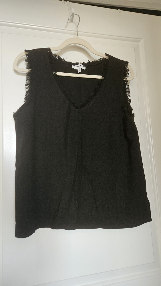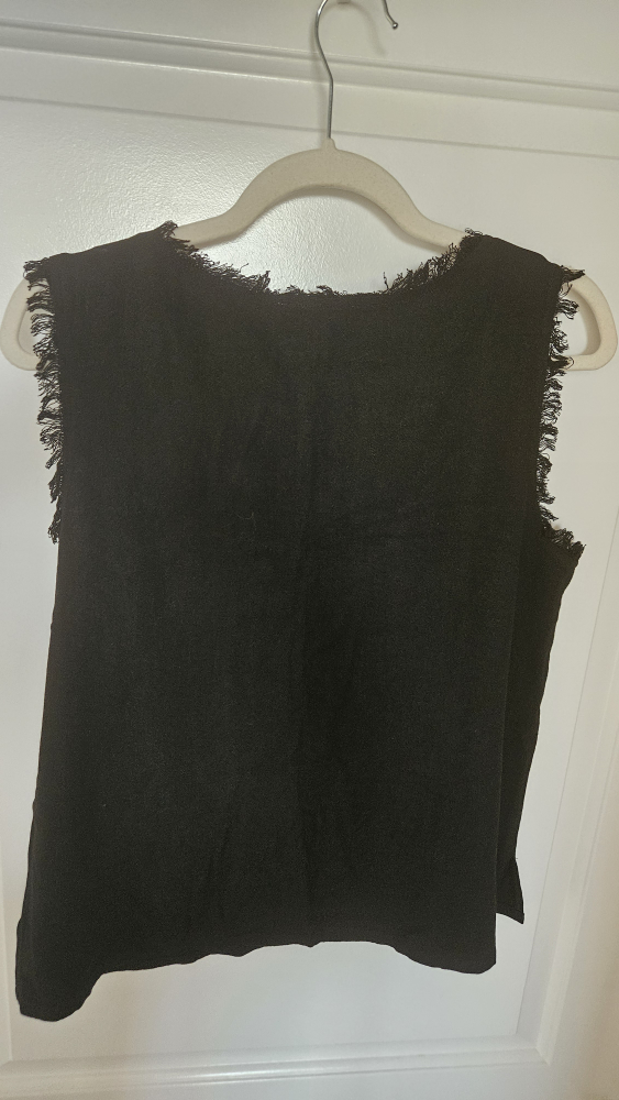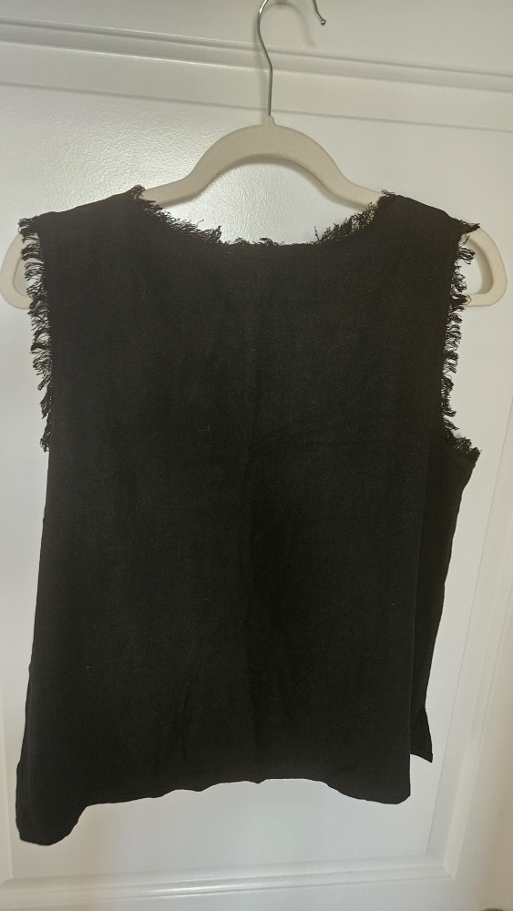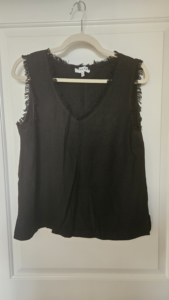Selling a Gilli sleeveless linen top in black. It's a size large and has a cute, fringed trim around the neckline and armholes. Perfect for layering or wearing on its own!