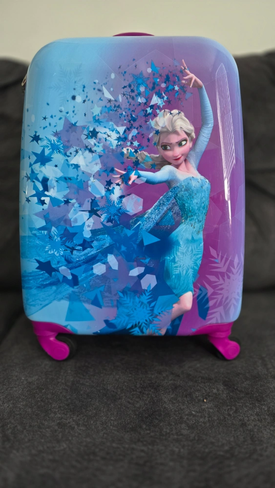 This is a cute Disney Frozen rolling suitcase for kids! It features Elsa on the front in a fun design, perfect for travel or sleepovers. The suitcase is in great condition and ready for its next adventure