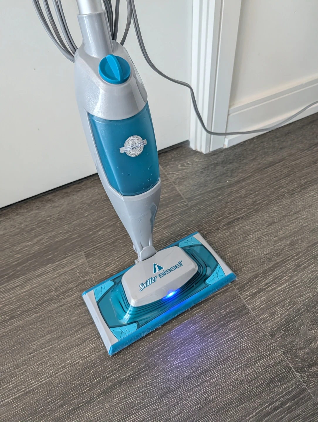 Gently used Bissell steam mop, model 8906. It's a 1000W household steam cleaner. This steam mop is great for quickly cleaning hard floors.