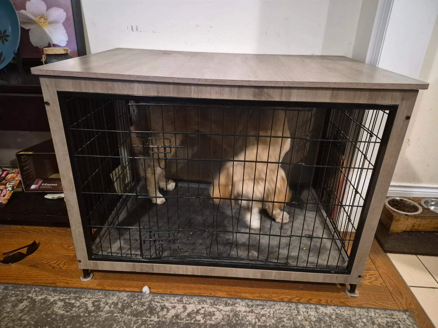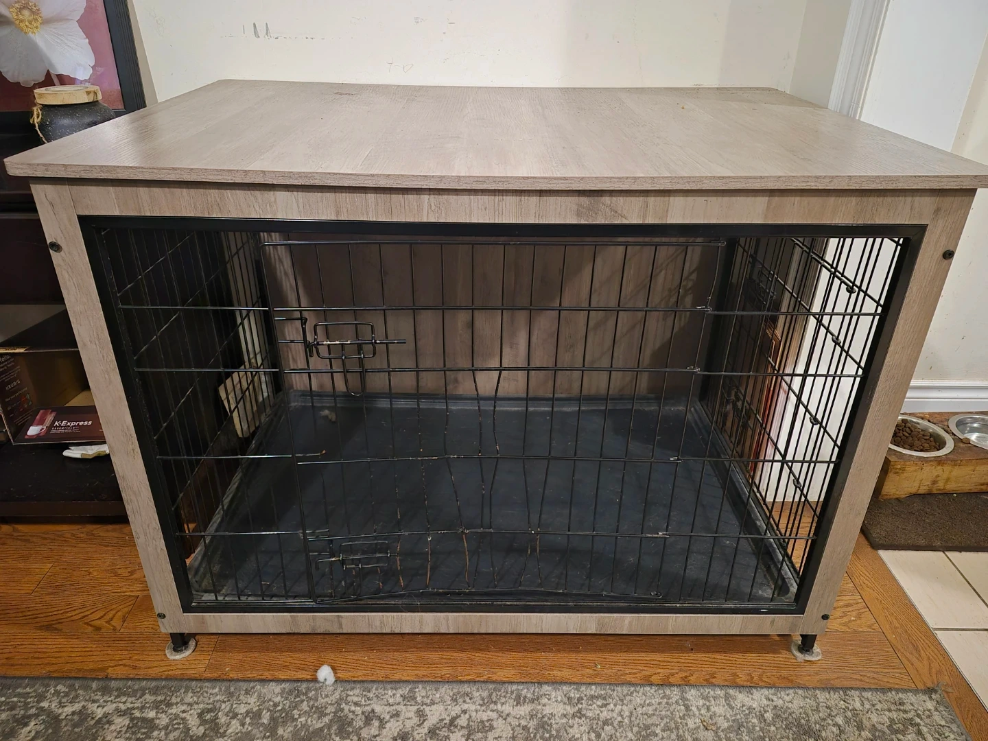 Dog crate furniture that doubles as an end table! It's in great condition and ready for a new furry friend. The crate is a neutral colour that will match most home decor