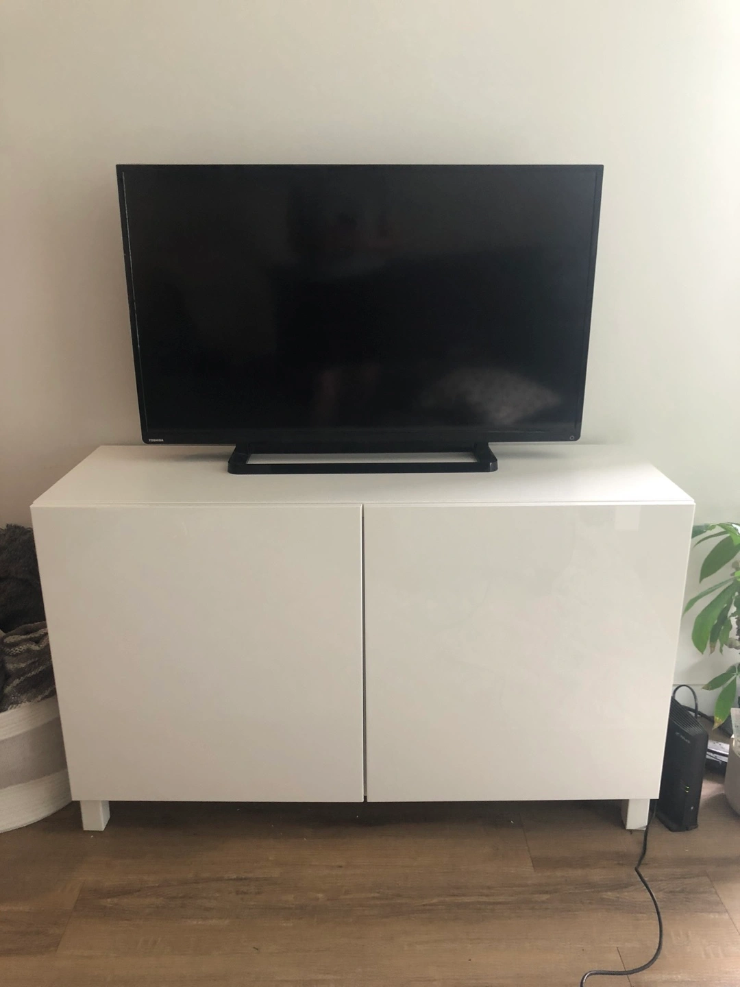 Selling a white TV stand from IKEA! It's in great shape with just a few small marks on top. White glossy doors elevates the look is the unit. Offers lots of storage space with adjustable shelves inside plus an extra shelf not used. Perfect for keeping your entertainment area tidy and organized.