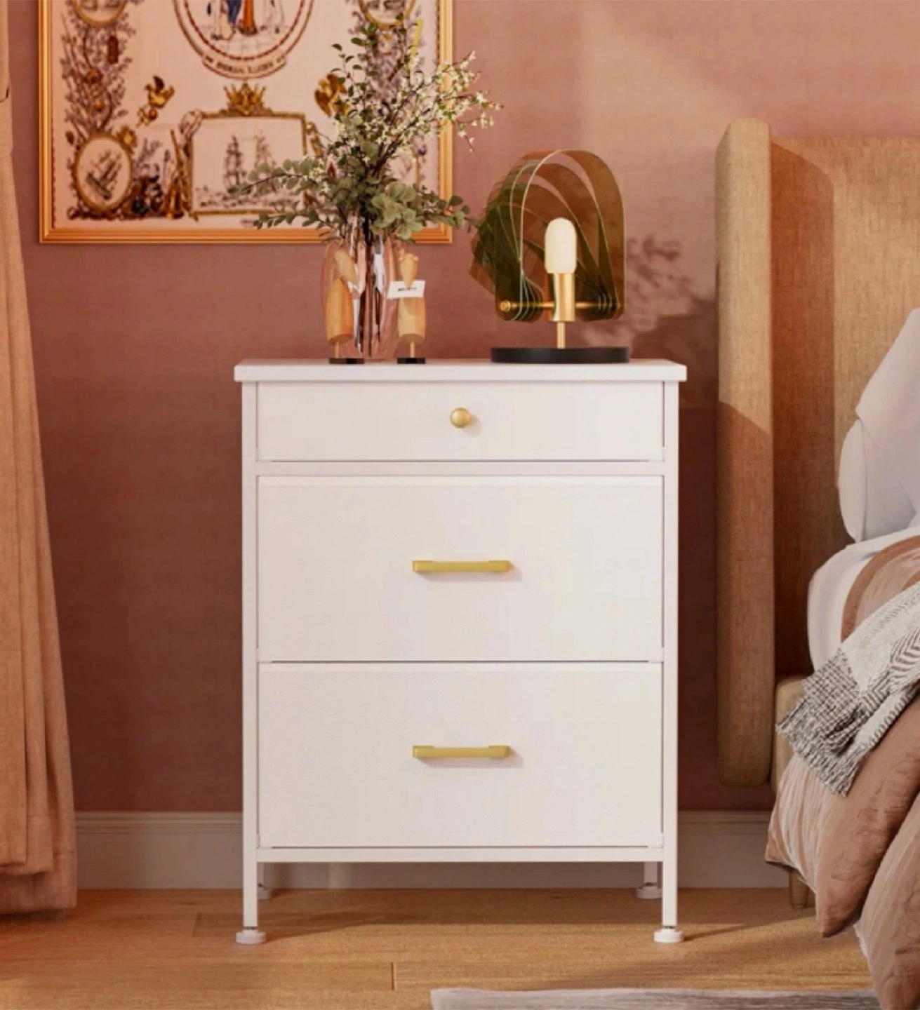 Three-drawer nightstand, dresser for bedroom, gold-toned knobs and bar pulls