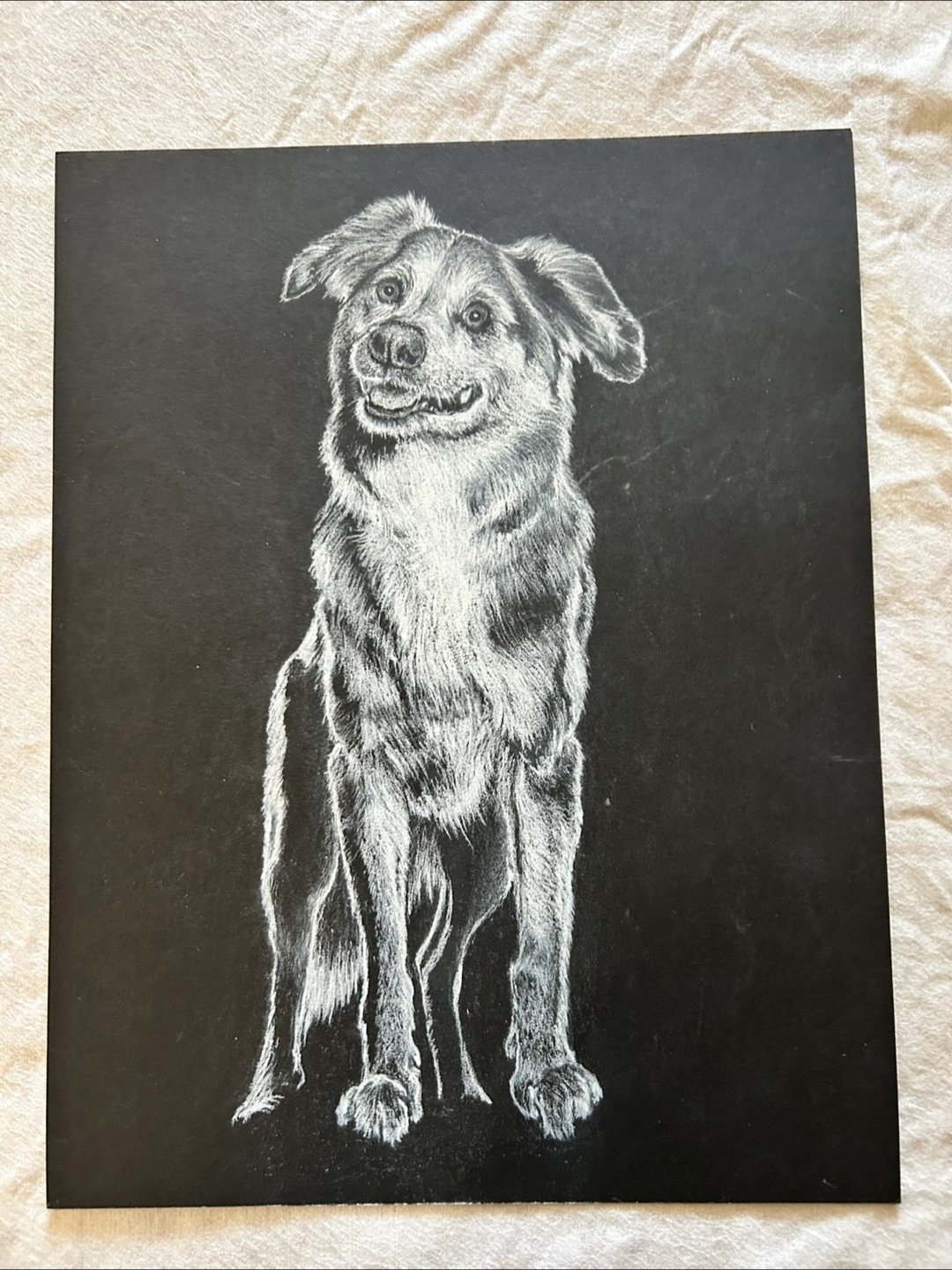 Hand drawn dog on black paper with white pencil crayon