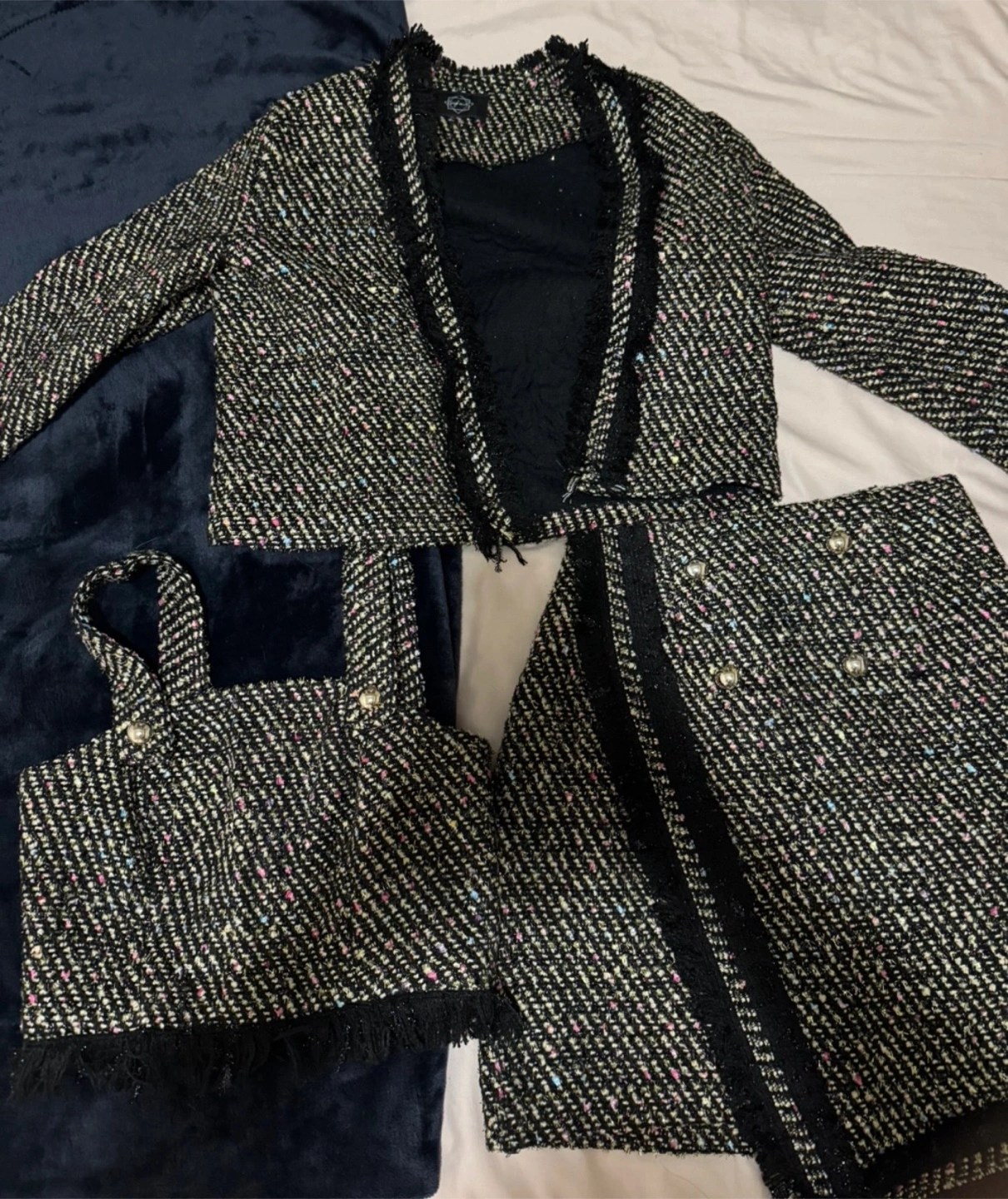 Adorable three-piece suit. Includes a cropped jacket, matching mini skirt, and a cute cropped cami. Black and cream tweed with colourful flecks. Fringe trim detail. Great for a night out or special occasion.
