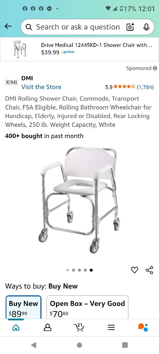 Selling a DMI Rolling Shower Chair in white. It's a commode and transport chair designed for elderly, injured, or disabled individuals. It features rear locking wheels and has a weight capacity of 250 lbs.