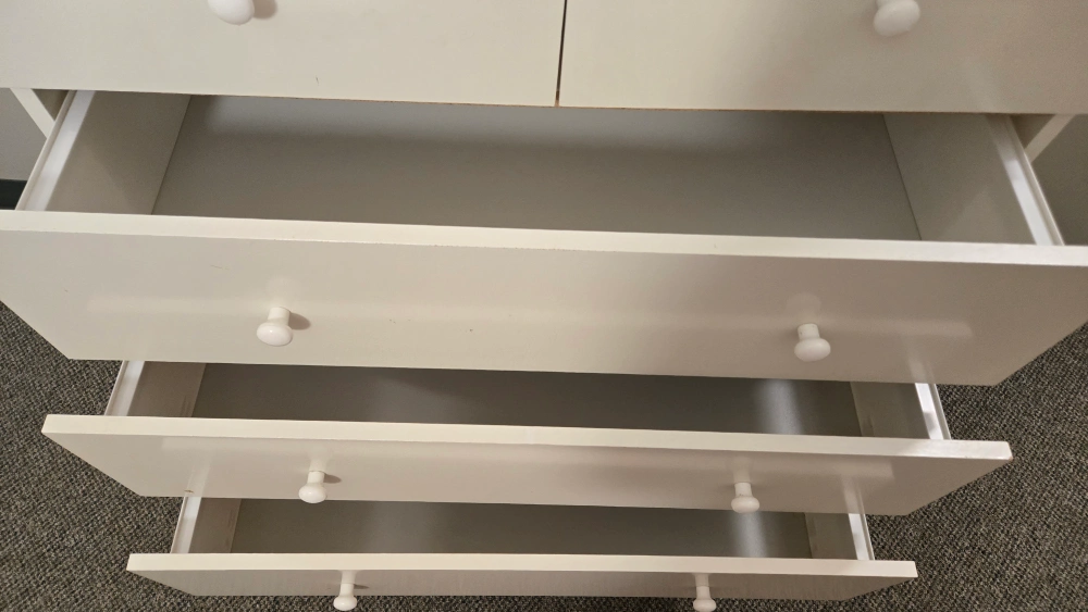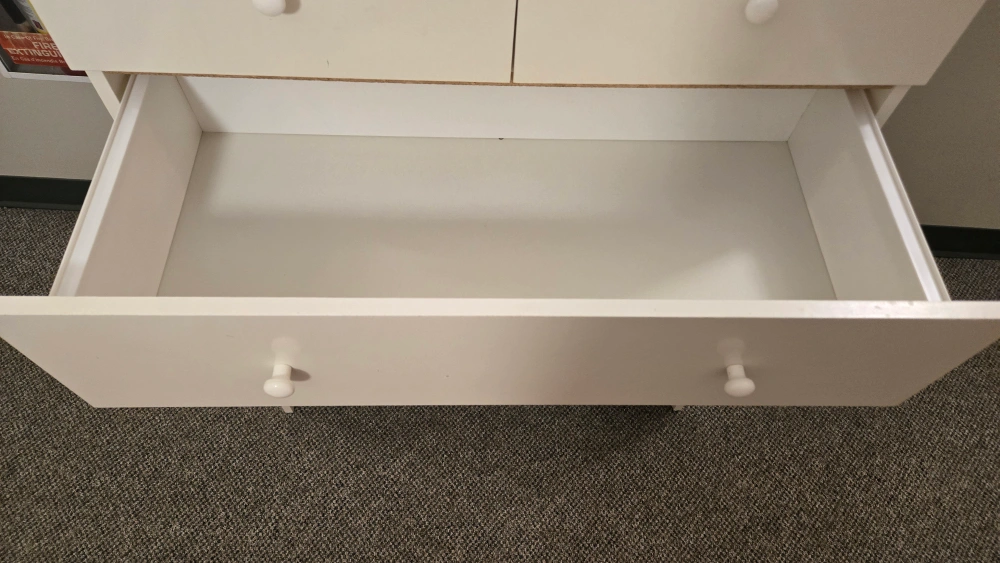 Selling a white dresser with 8 drawers. It's perfect for adding storage to any room! It has a few minor scratches, but overall it's in good condition.