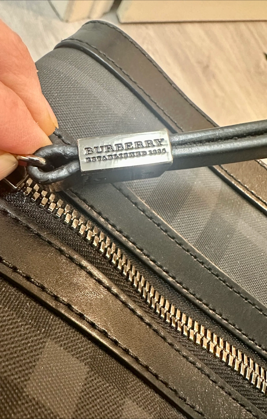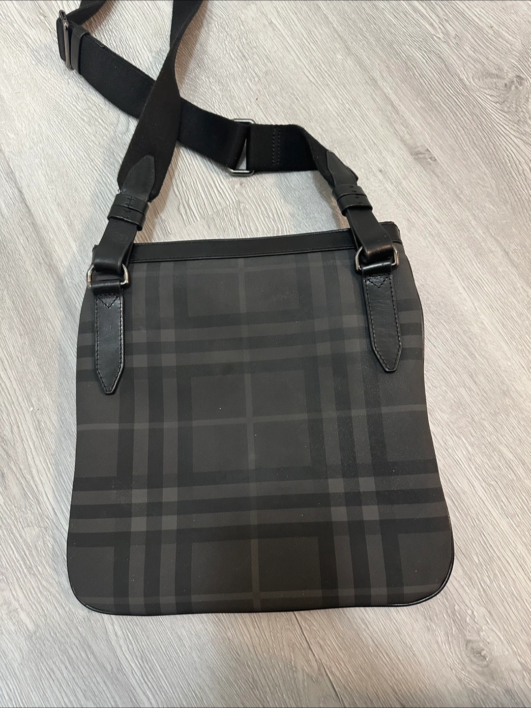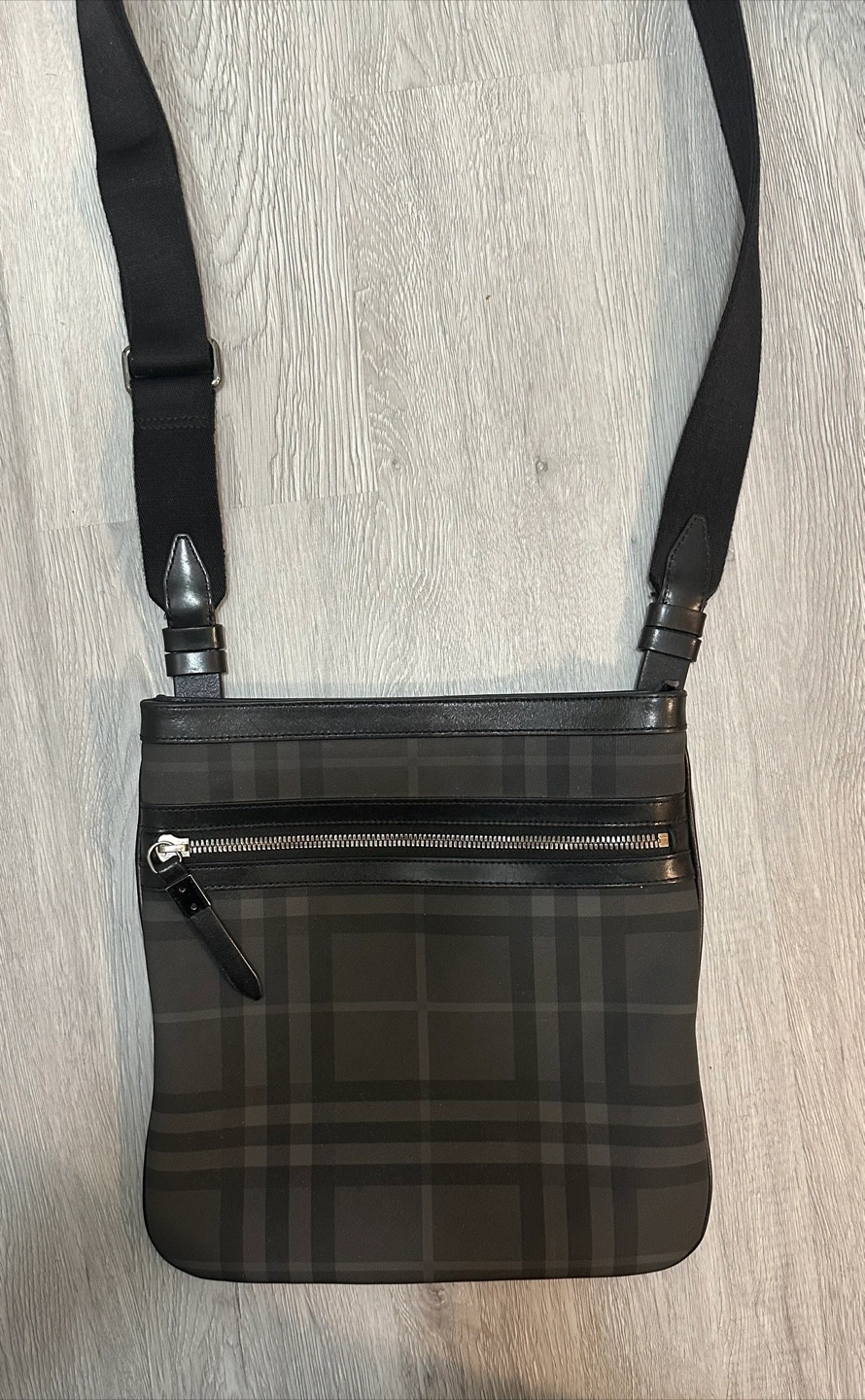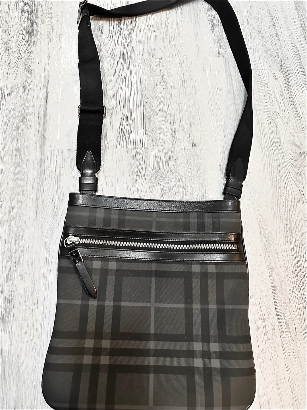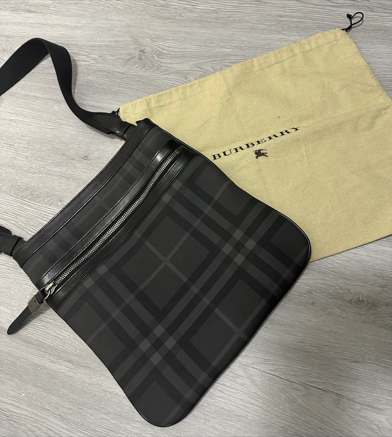 Selling a Burberry crossbody bag in a sleek black plaid pattern. It's in great condition and comes with a dust bag to keep it protected when you're not using it. Perfect for carrying your essentials in style!