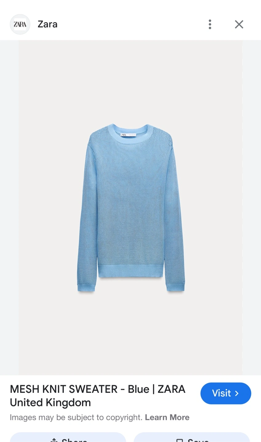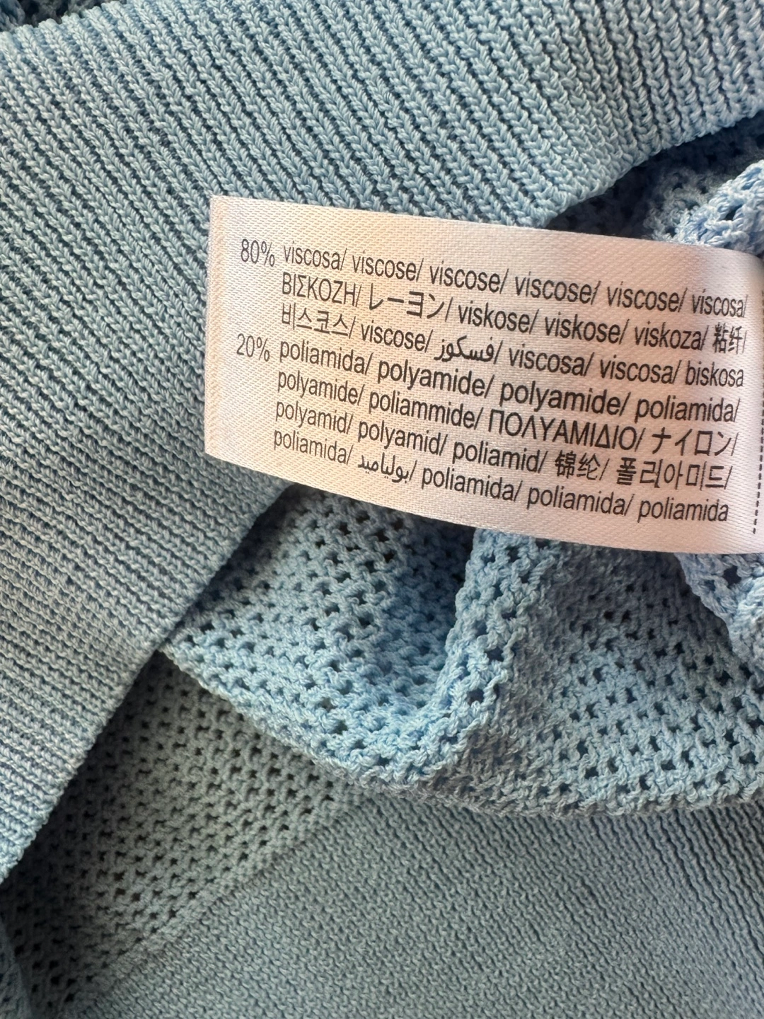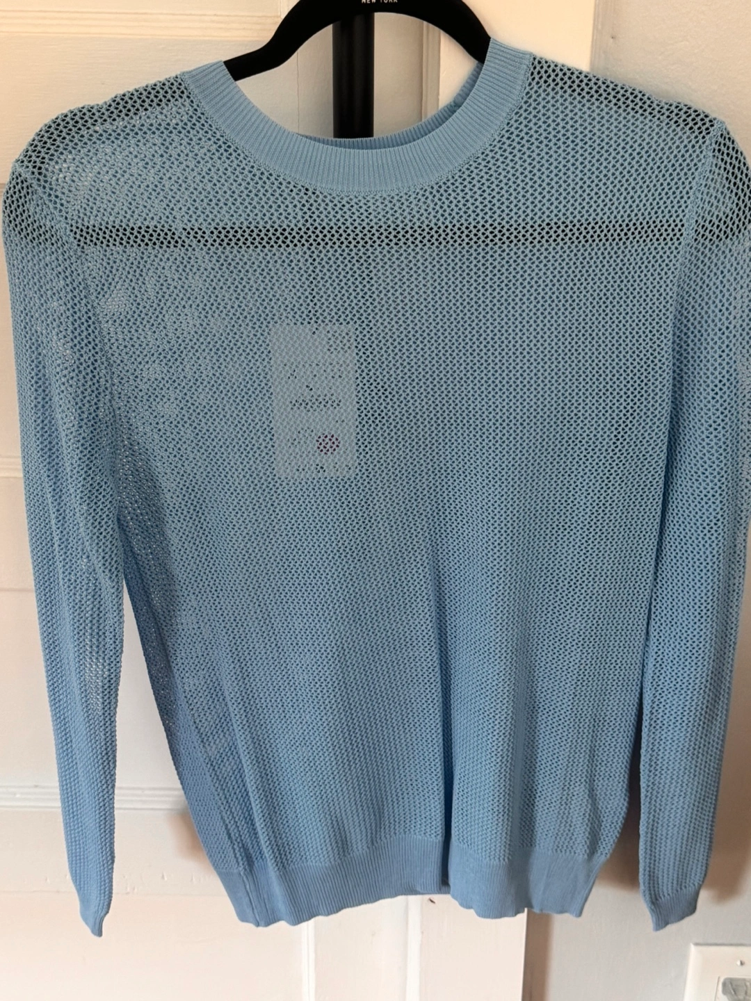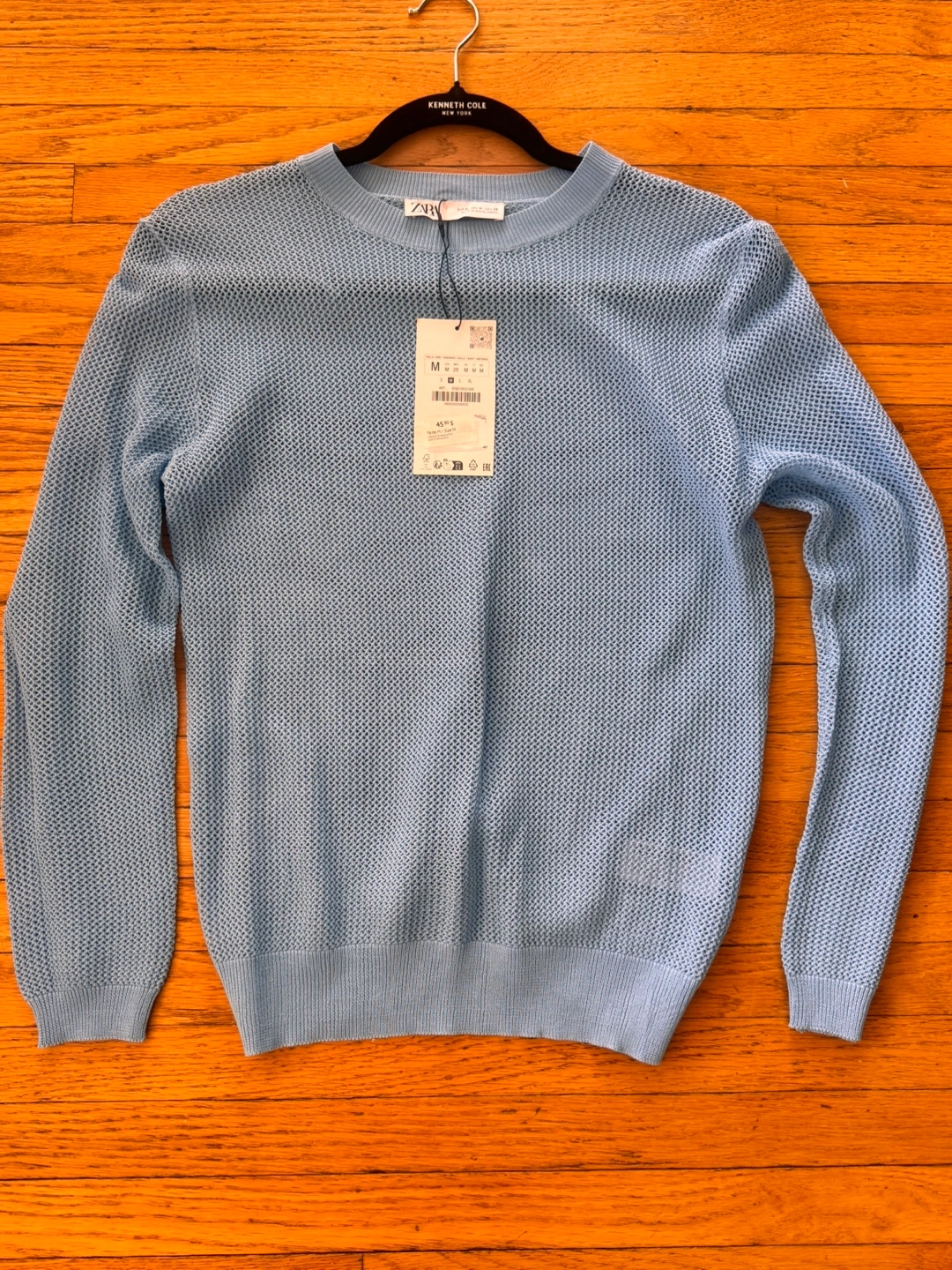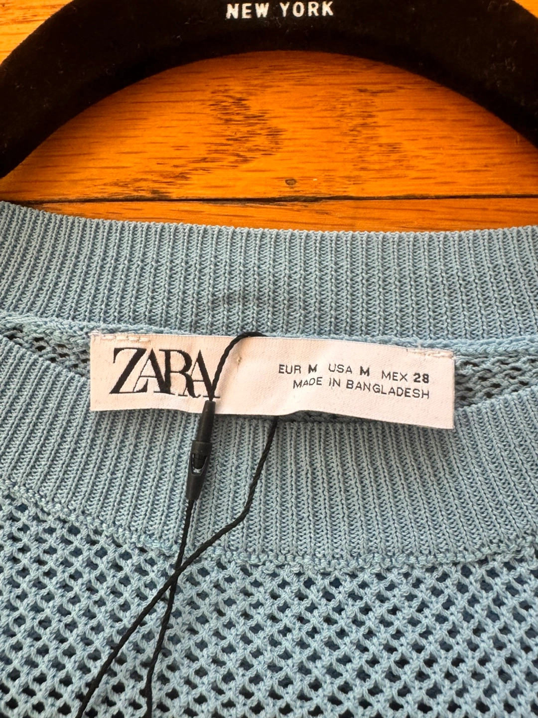 Selling a Zara mesh knit sweater in a lovely blue colour! It's a size medium and made of 80% viscose and 20% polyamide. Perfect for layering or wearing on its own during warmer weather! This new with tag. Pick up location in Long branch and reasonable offers