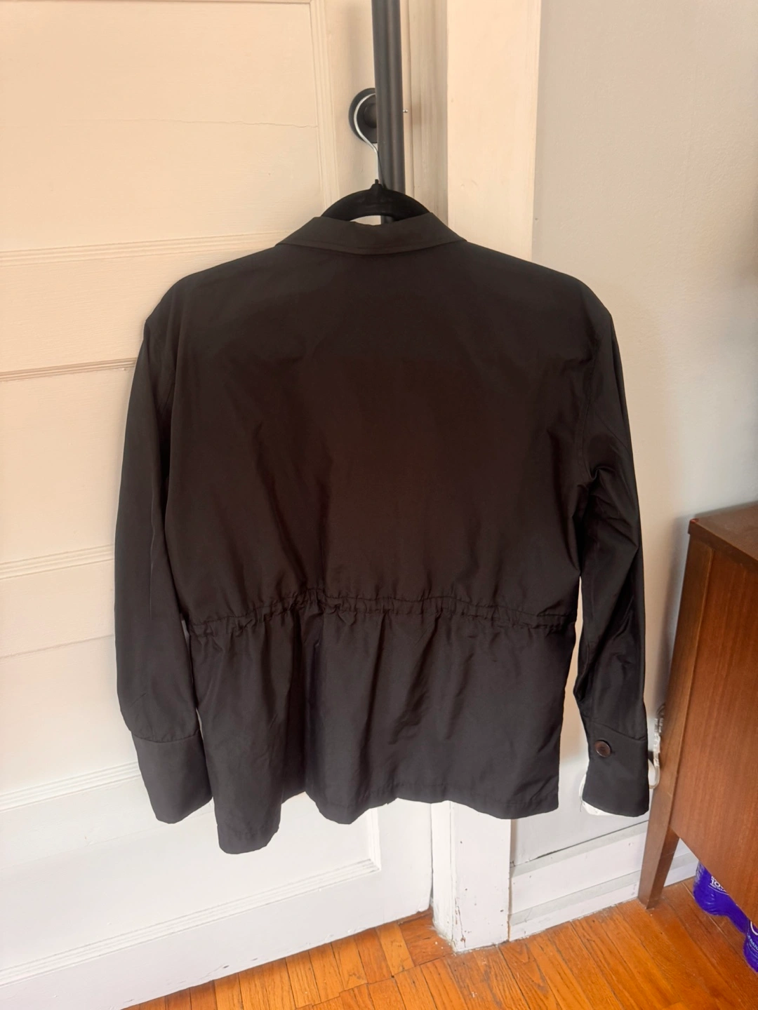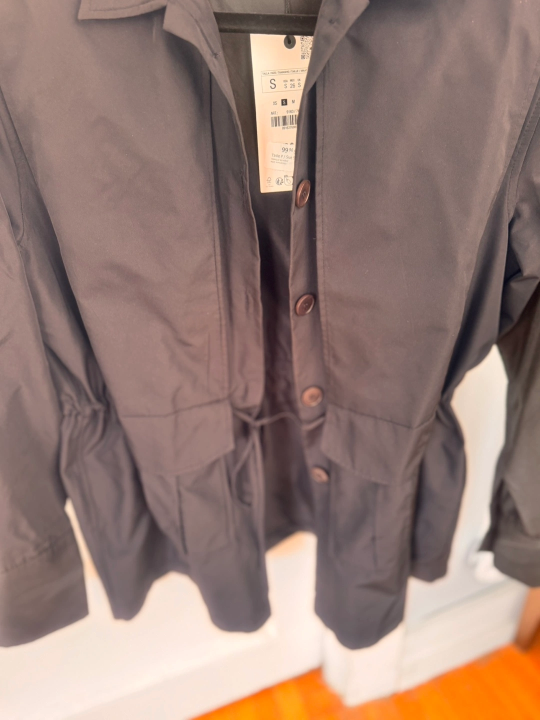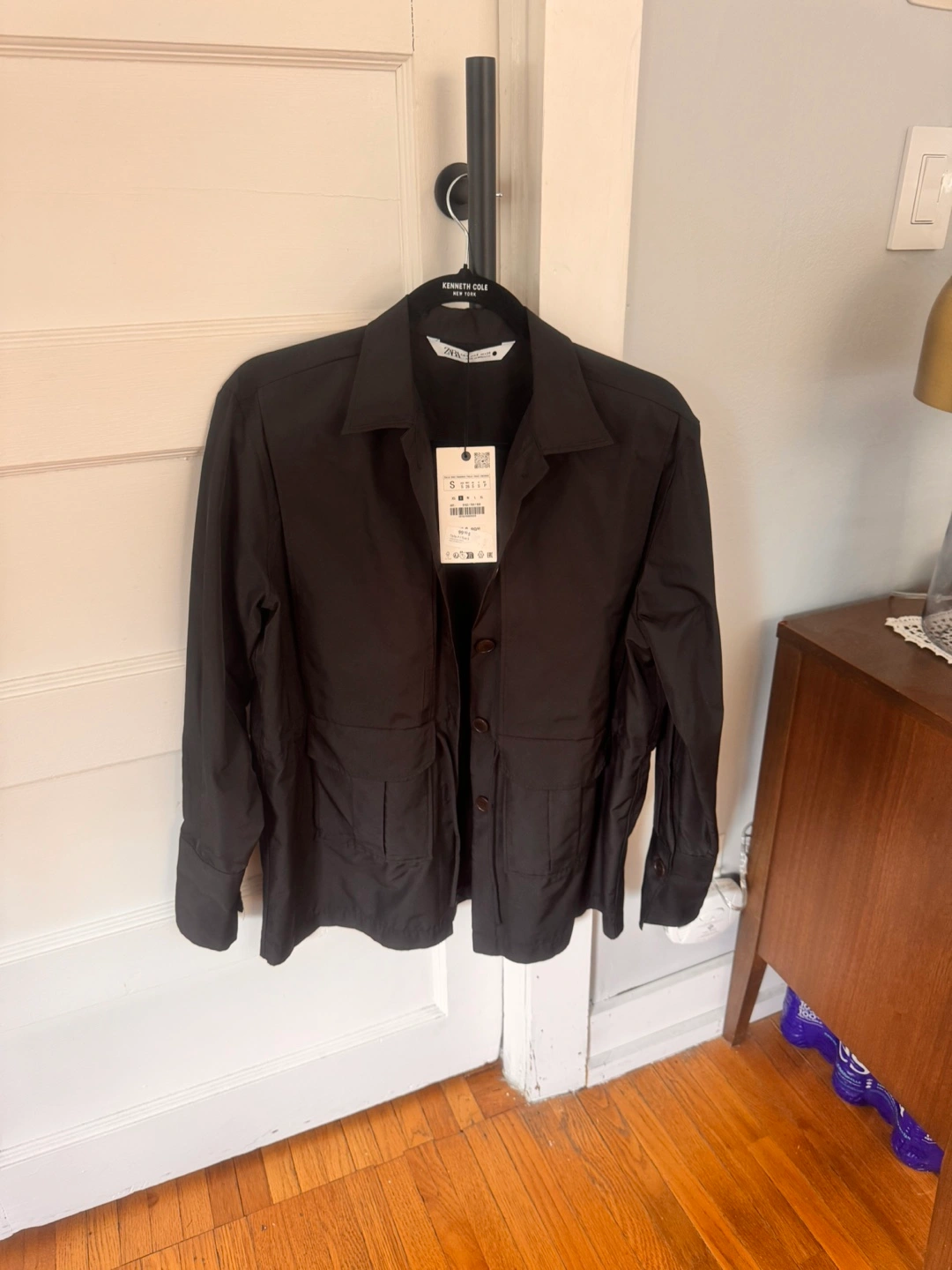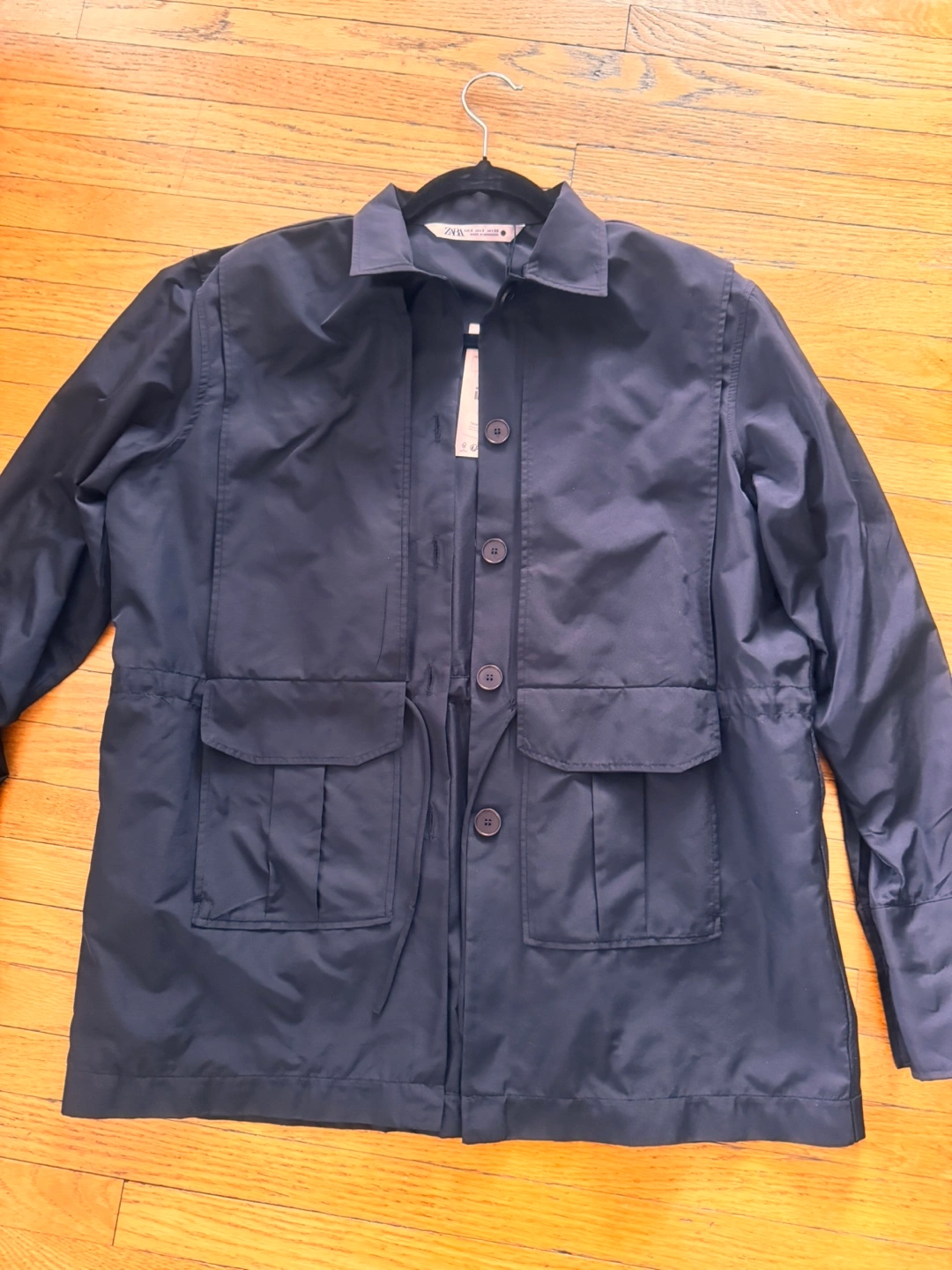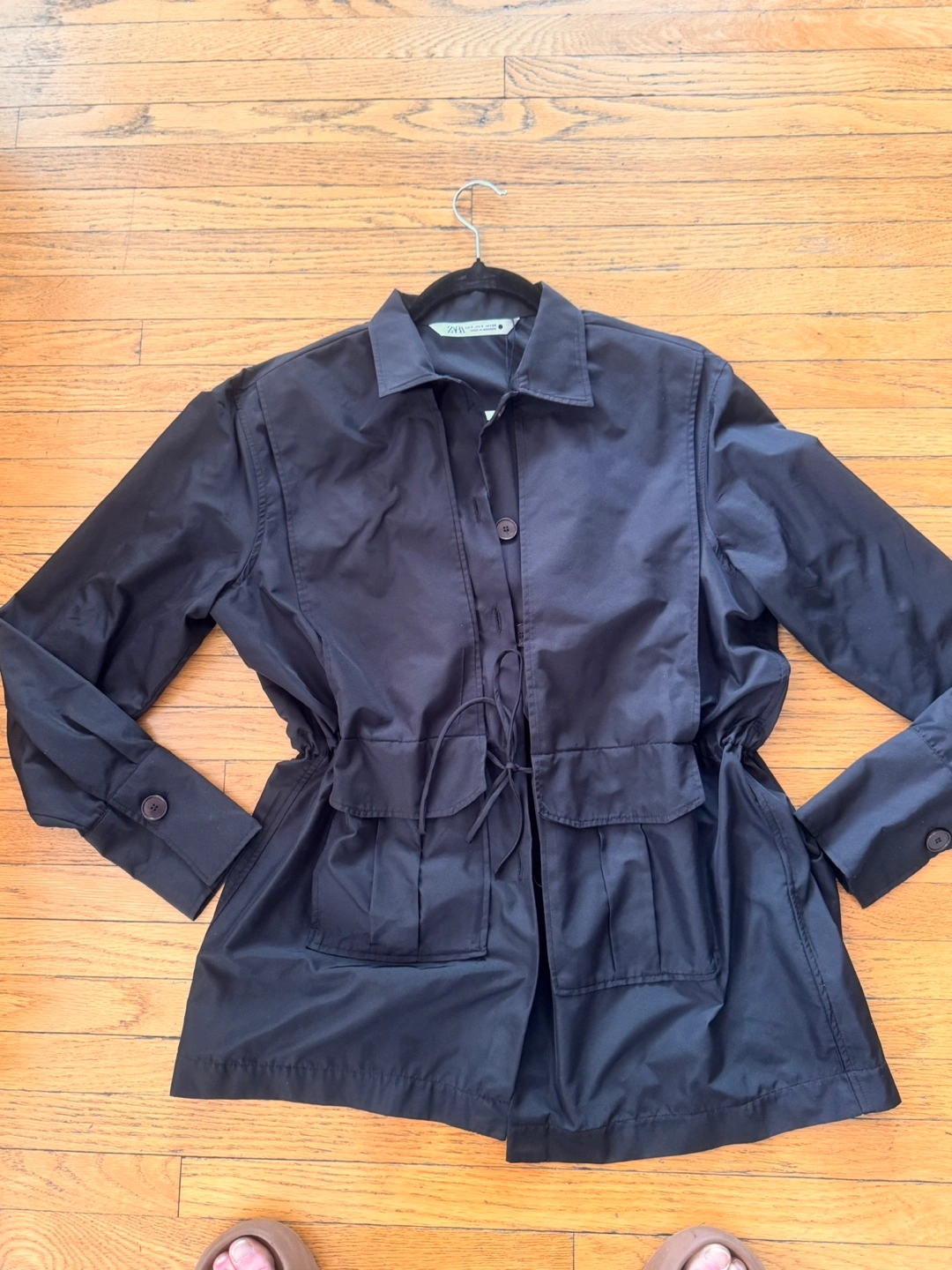 Selling a Zara black button-up jacket! It features a drawstring at the waist and four front pockets. Perfect for layering or wearing on its own. New with tag see the regular price. Pick up location in Long branch reasonable offers cash only