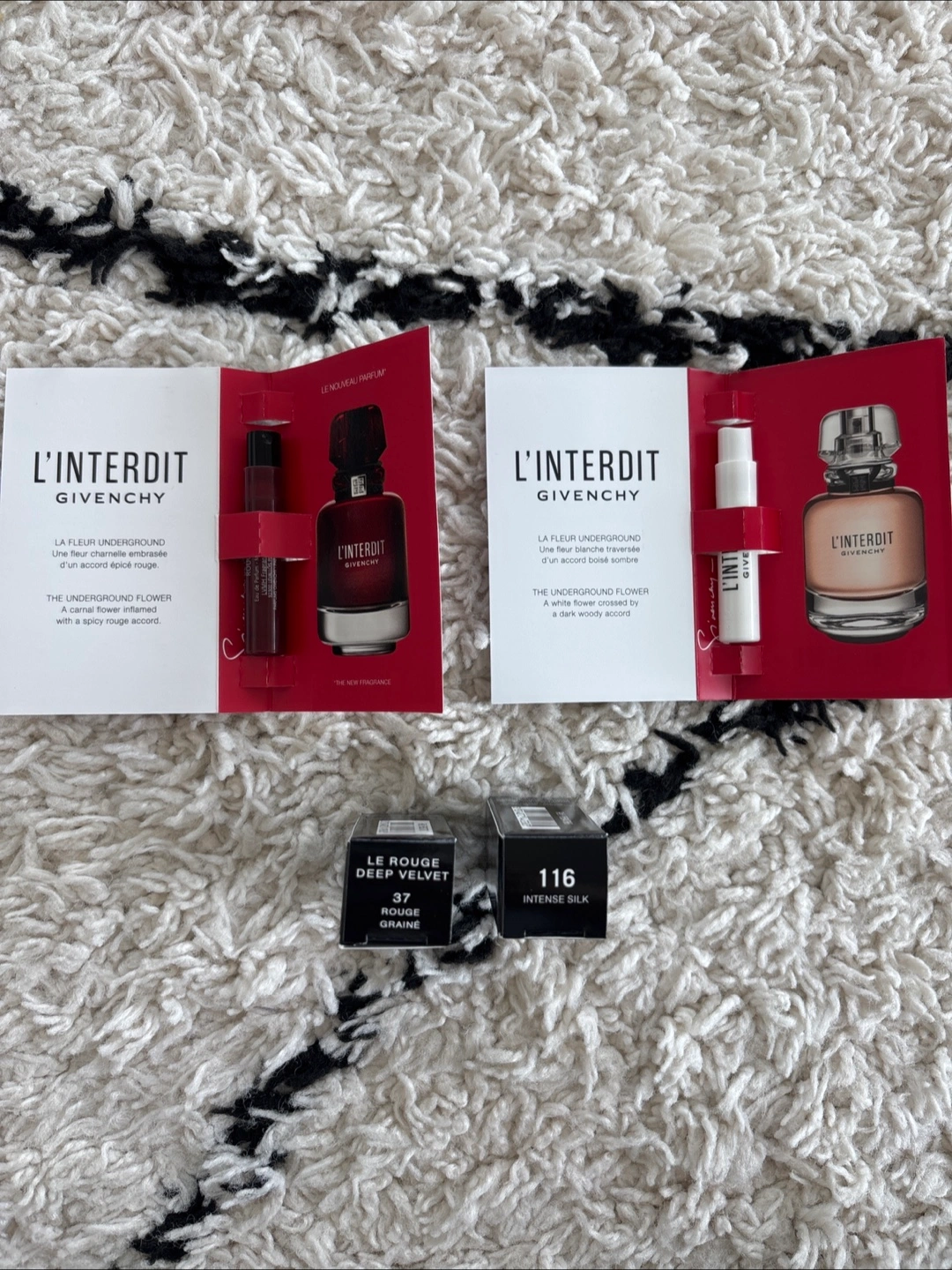 Selling Givenchy L'Interdit perfume samples and Le Rouge Deep Velvet lipstick samples! Perfect for trying out these iconic products before committing to a full size. Includes L'Interdit Eau de Parfum Rouge and Intense Silk, as well as Le Rouge Deep Velvet in shades 37 Rouge Graine and 116 Intense Silk