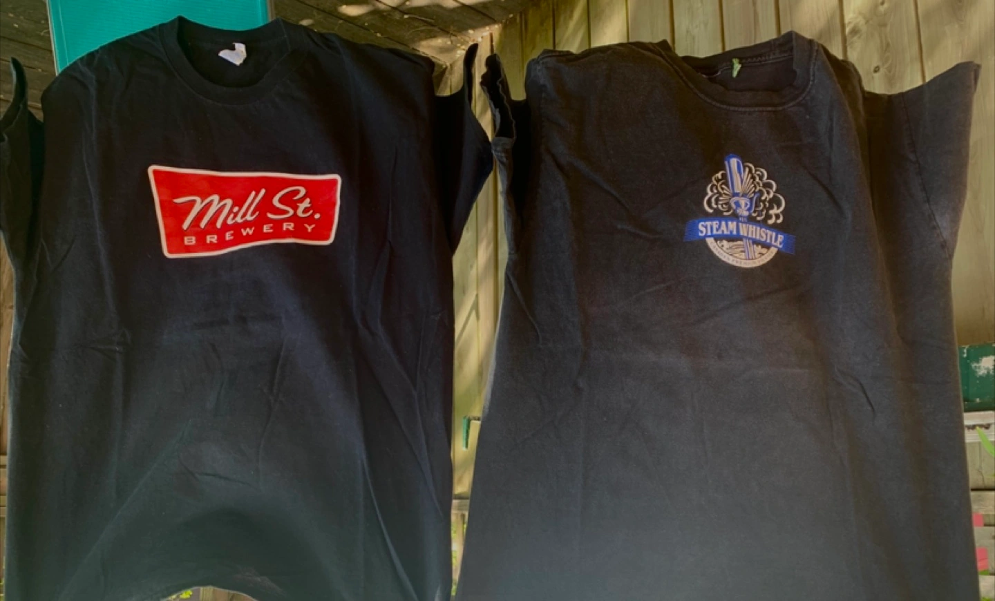 Two brewery t-shirts for sale. One is a black Mill St. Brewery shirt, and the other is a black Steam Whistle shirt. Both are in good condition and ready for a new home.
