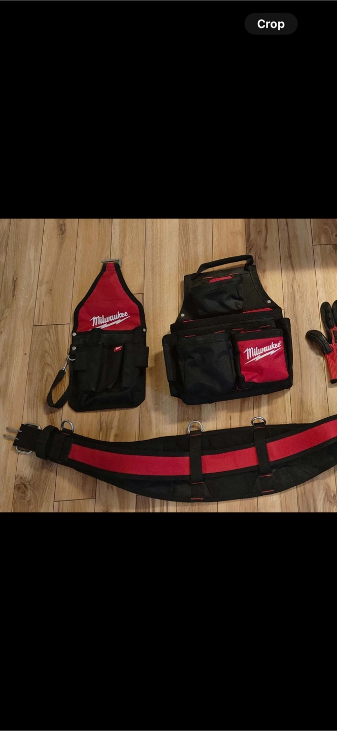 31Selling a Milwaukee tool belt set, which includes various pouches and a pair of gloves! The set features the Milwaukee logo in red and white on the black material. Great for any construction or DIY projects!