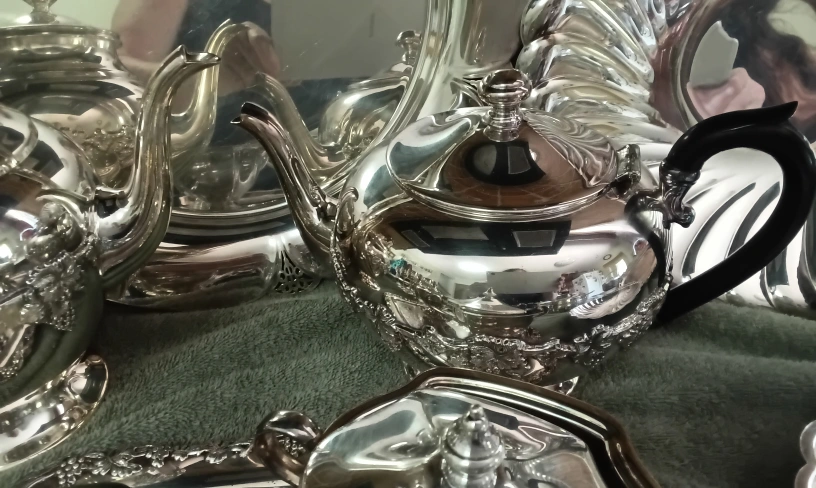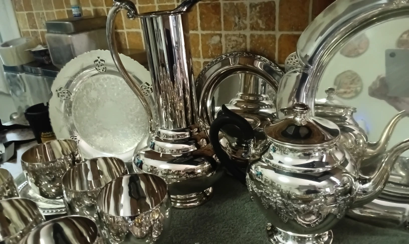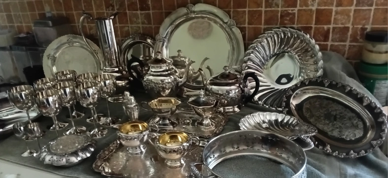 Embrace timeless elegance with this Antique Rogers and E.B Copper SPBM Silver Plated Tea and Coffee Pots , Creamer & Sugar Bowls Sets , Tall Water Vessel , Many Trays, 8 x Wine Goblets plus 2 x Smaller Goblets .