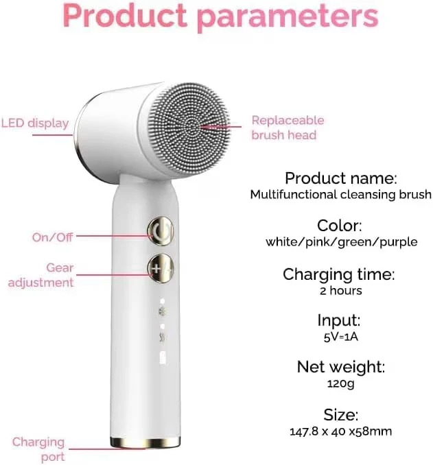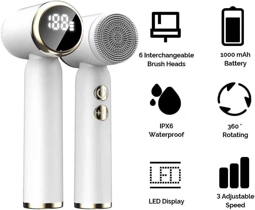 This multifunctional cleansing brush comes with six interchangeable heads for various skincare needs. It's IPX6 waterproof and features a 1000 mAh battery with a 2-hour charging time. The device offers 3 adjustable speeds and an LED display for settings.