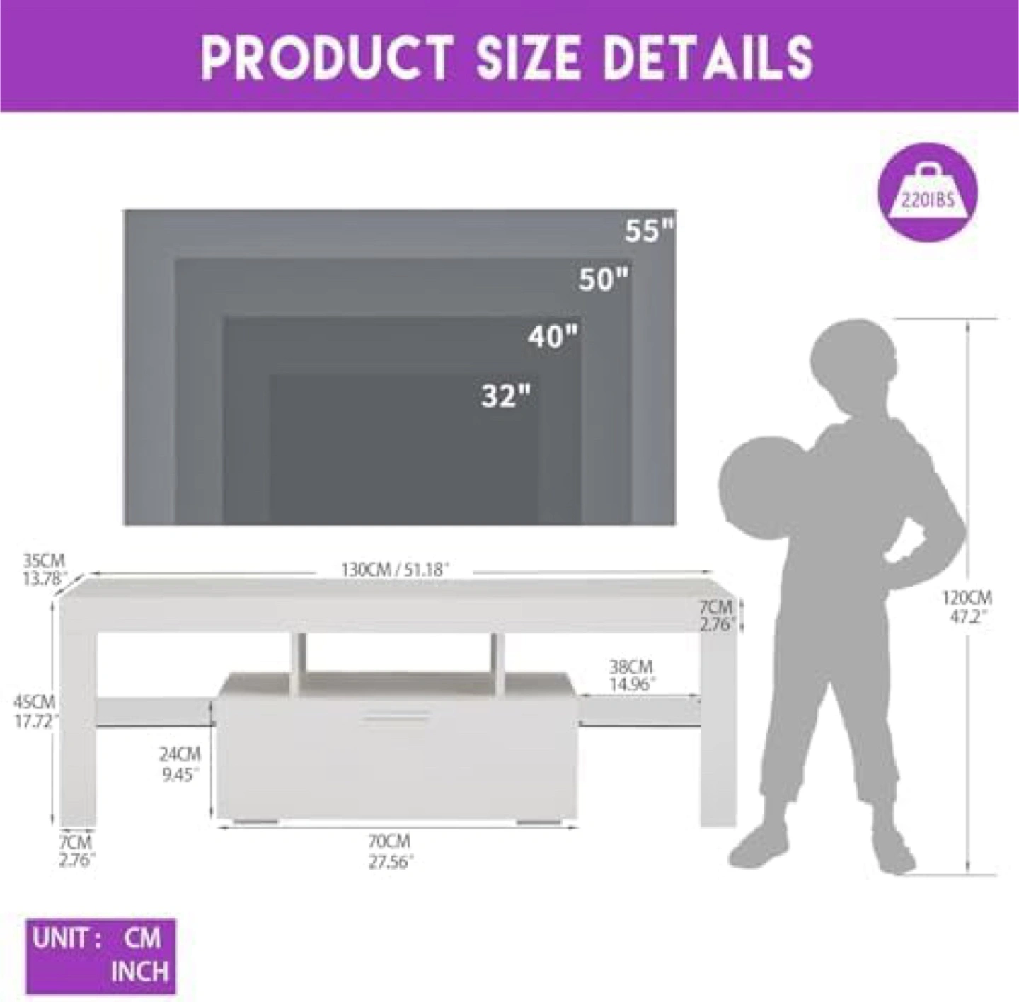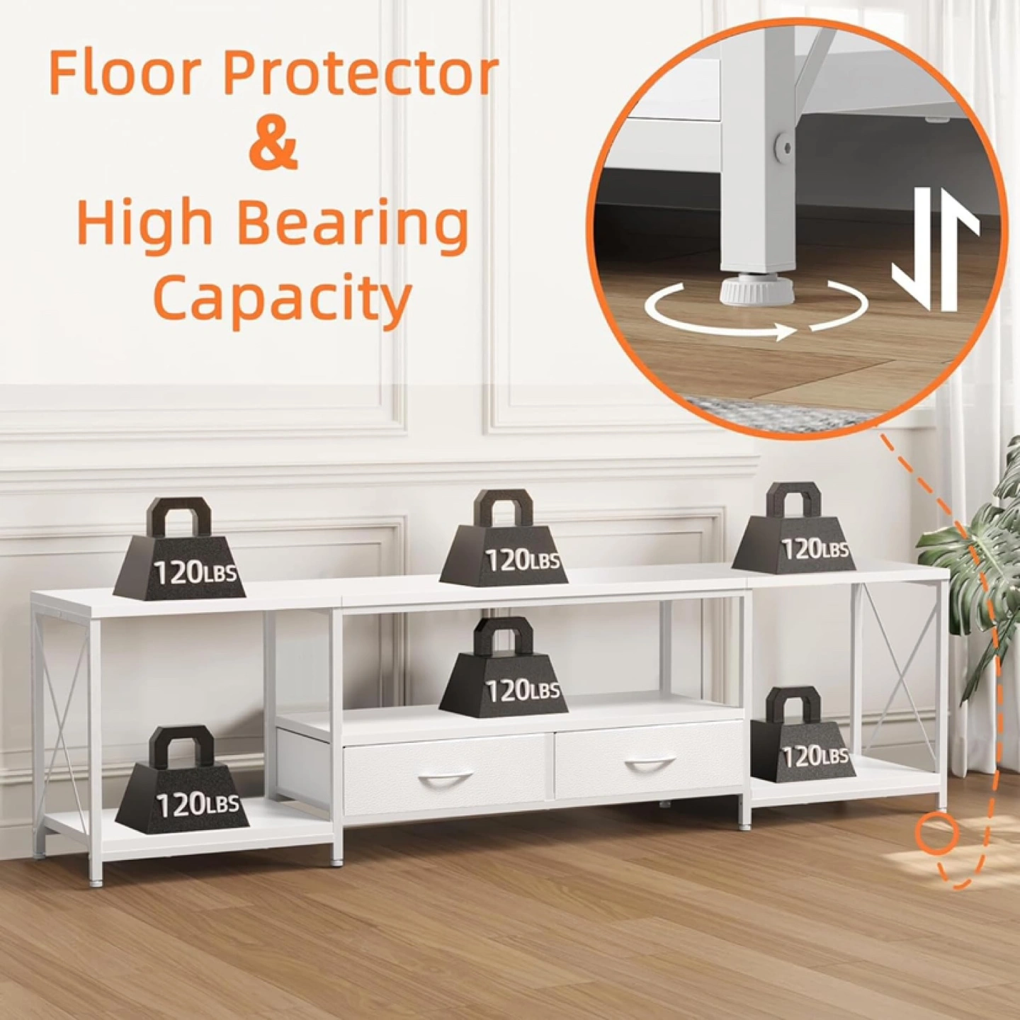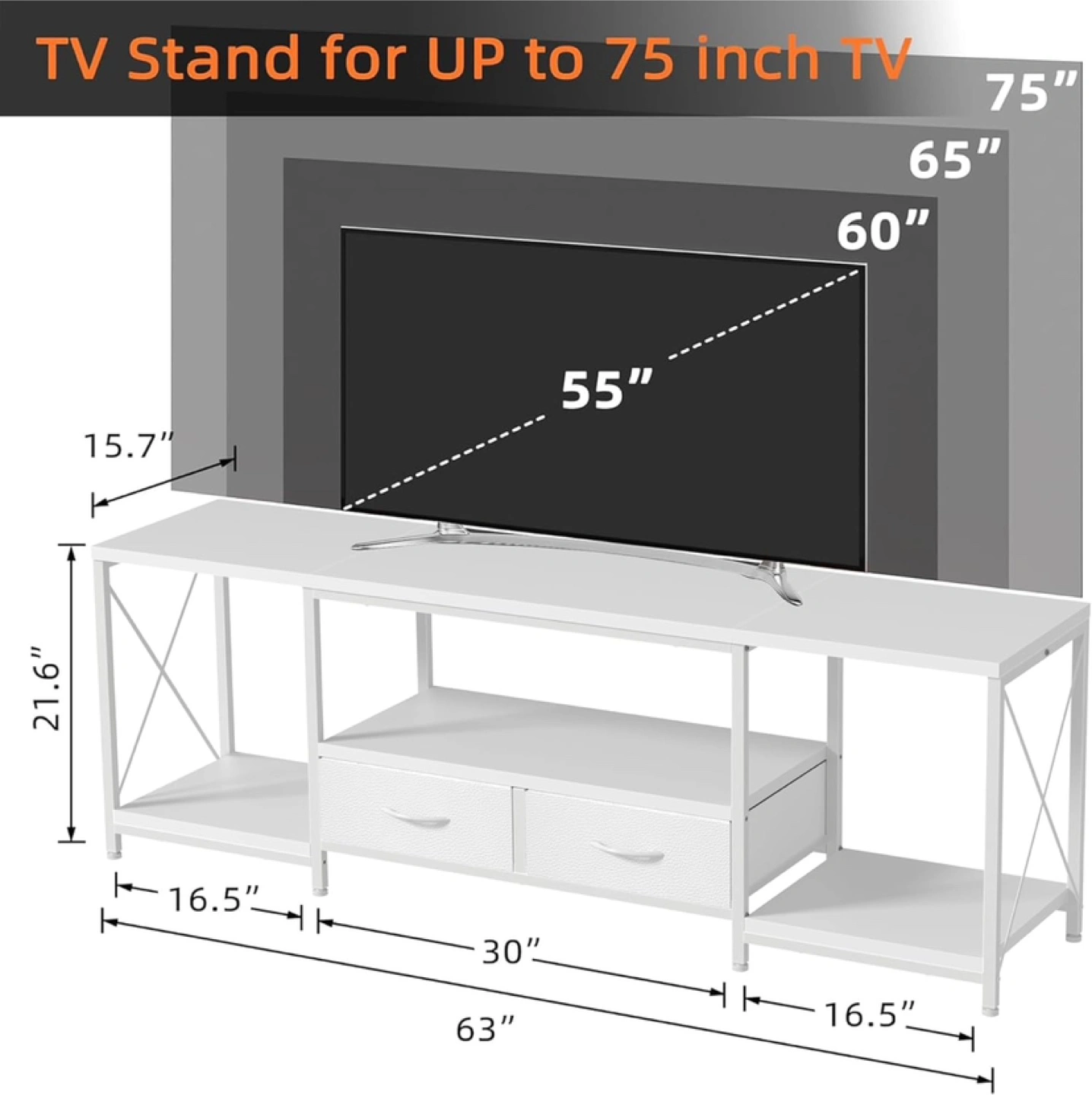 This TV stand is perfect for TVs up to 75 inches! It helps maintain a tidy space and offers uncluttered living. It also features floor protectors and a high bearing capacity. The dimensions are approximately 63 inches wide, 21.6 inches high, and 15.7 inches deep