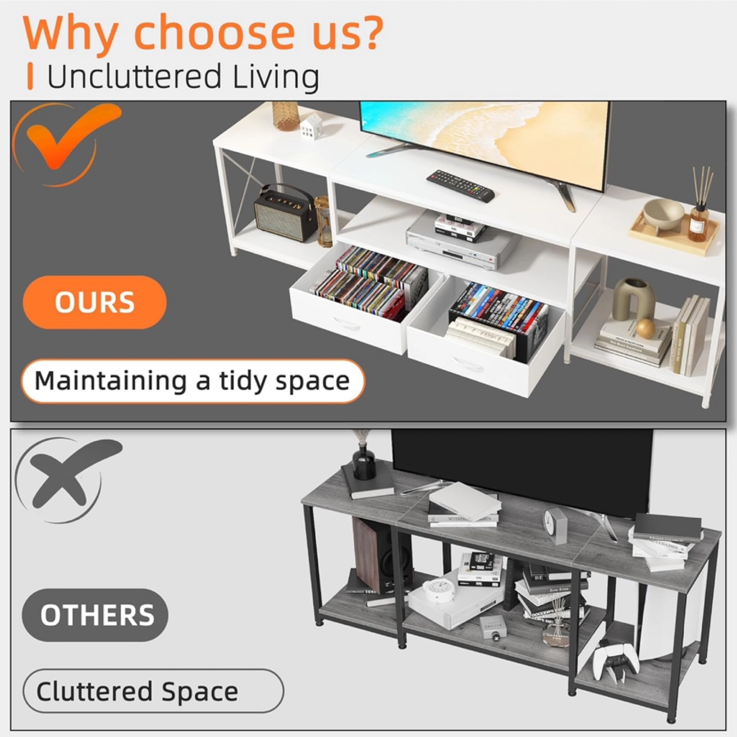 This TV stand is perfect for TVs up to 75 inches! It helps maintain a tidy space and offers uncluttered living. It also features floor protectors and a high bearing capacity. The dimensions are approximately 63 inches wide, 21.6 inches high, and 15.7 inches deep